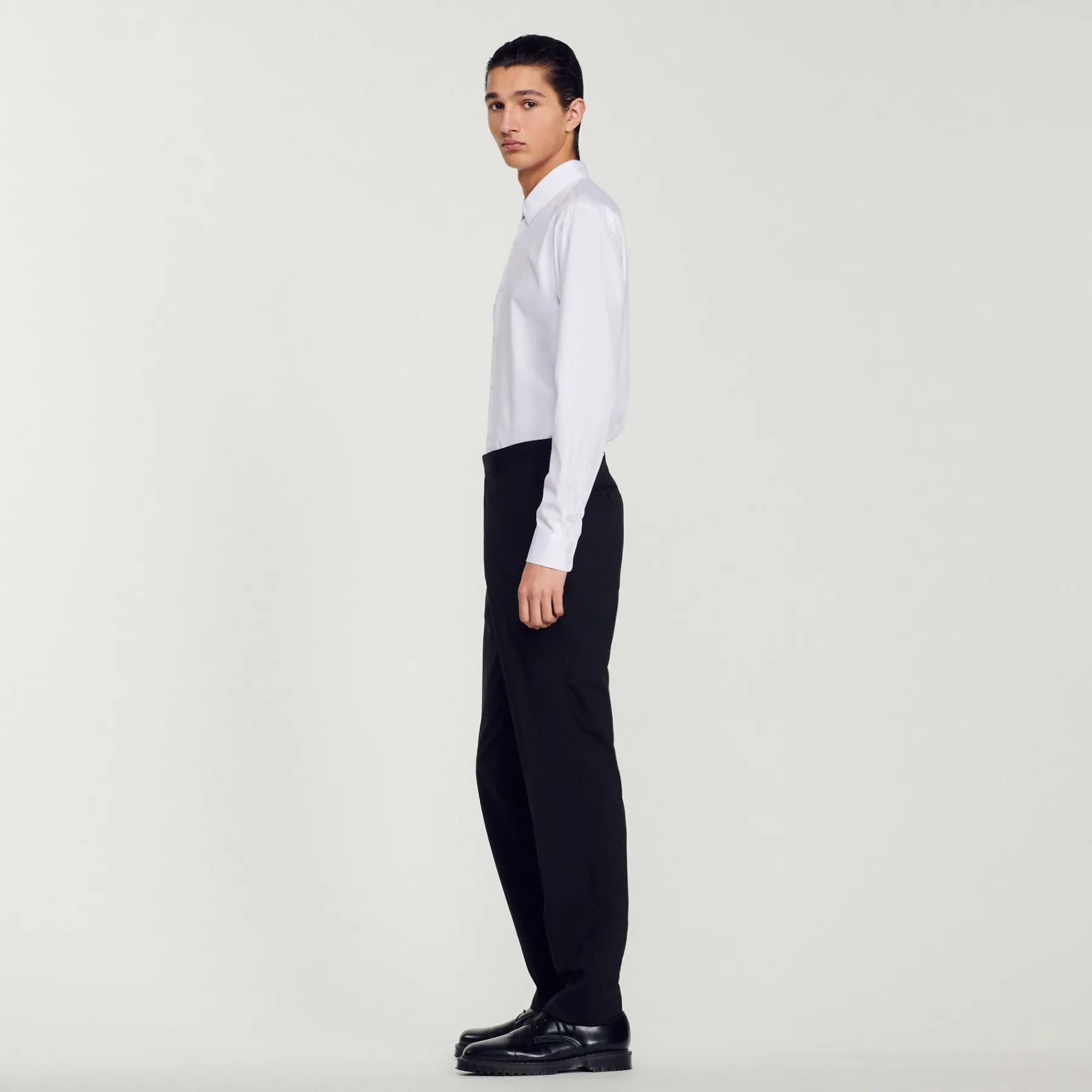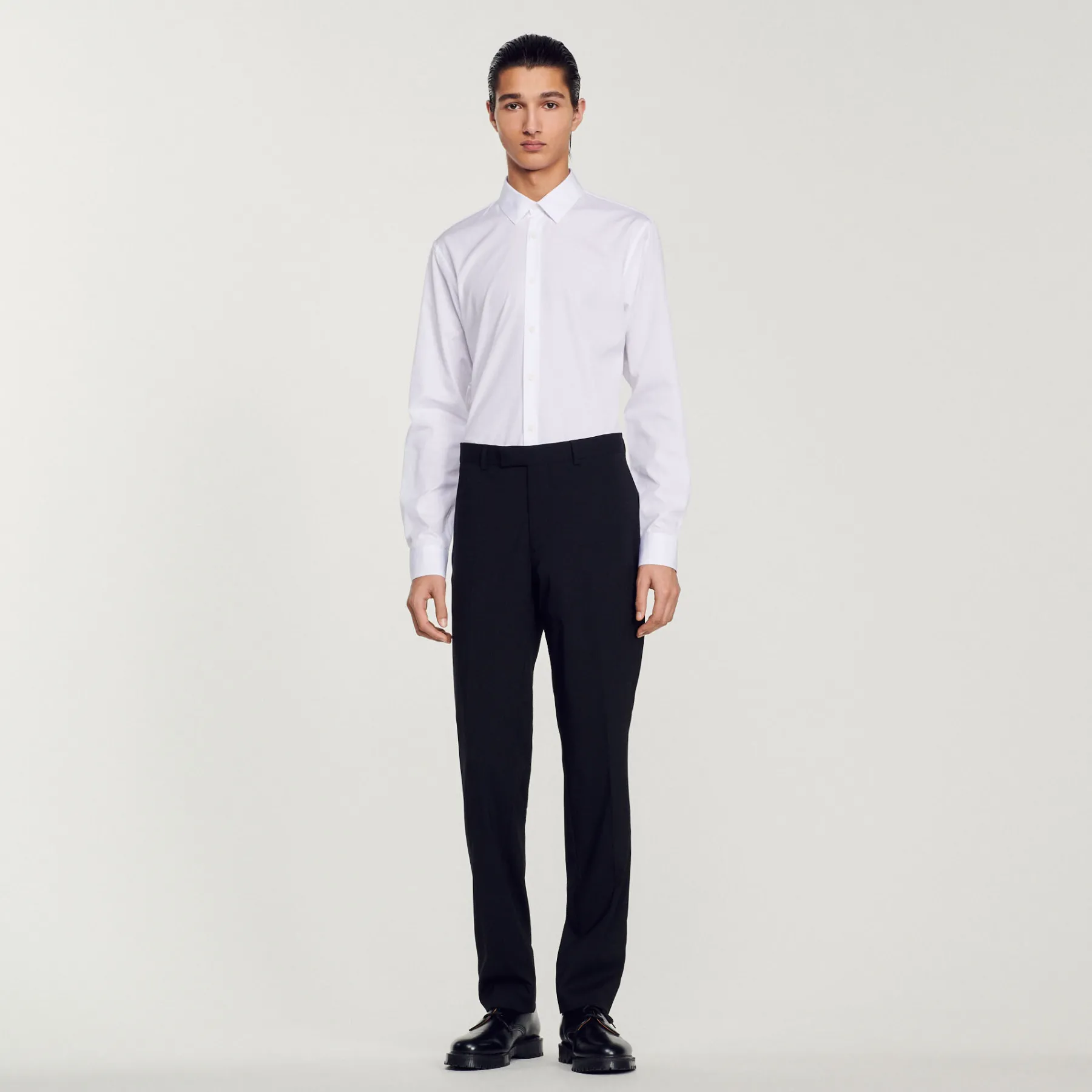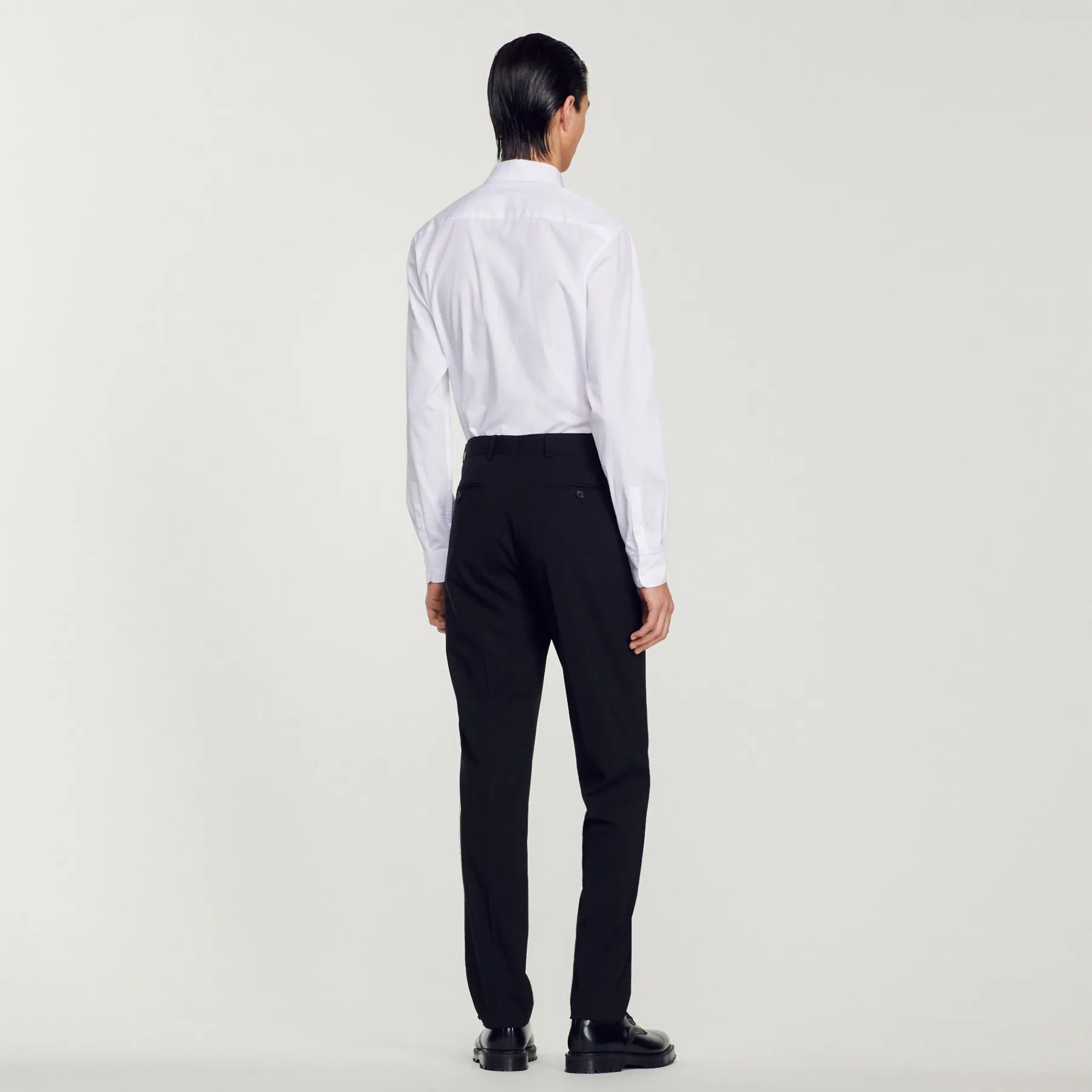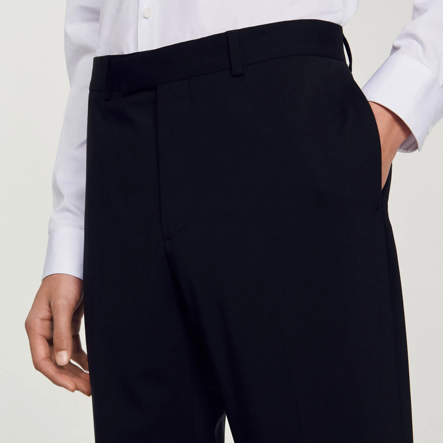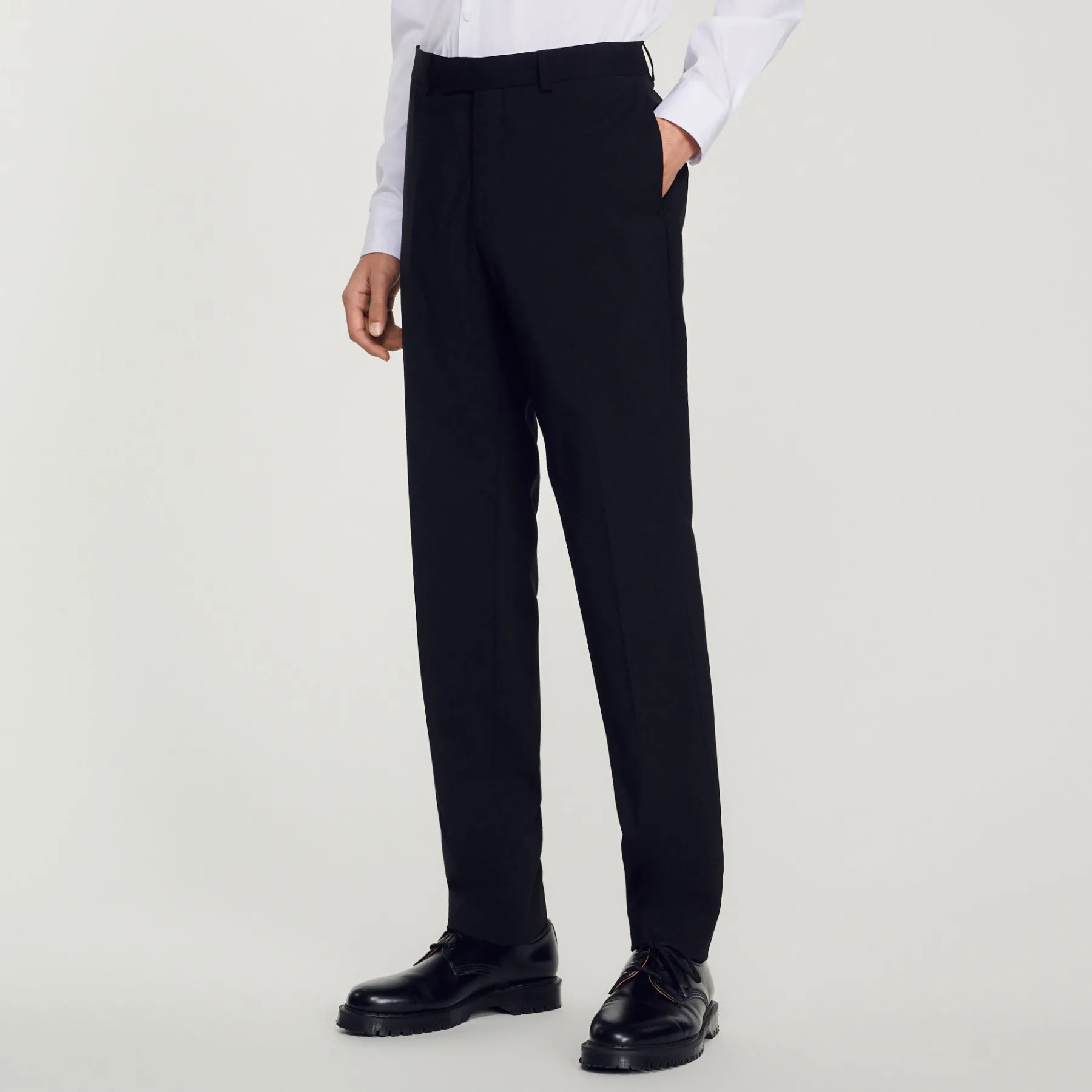 Wool suit pants with a classic cut and pockets. • Sandro Men’s suit pants • Classic cut • Pockets at the sides • Hook fastening • Piped pockets at the back Model is wearing a size 38 and is 6’1”
