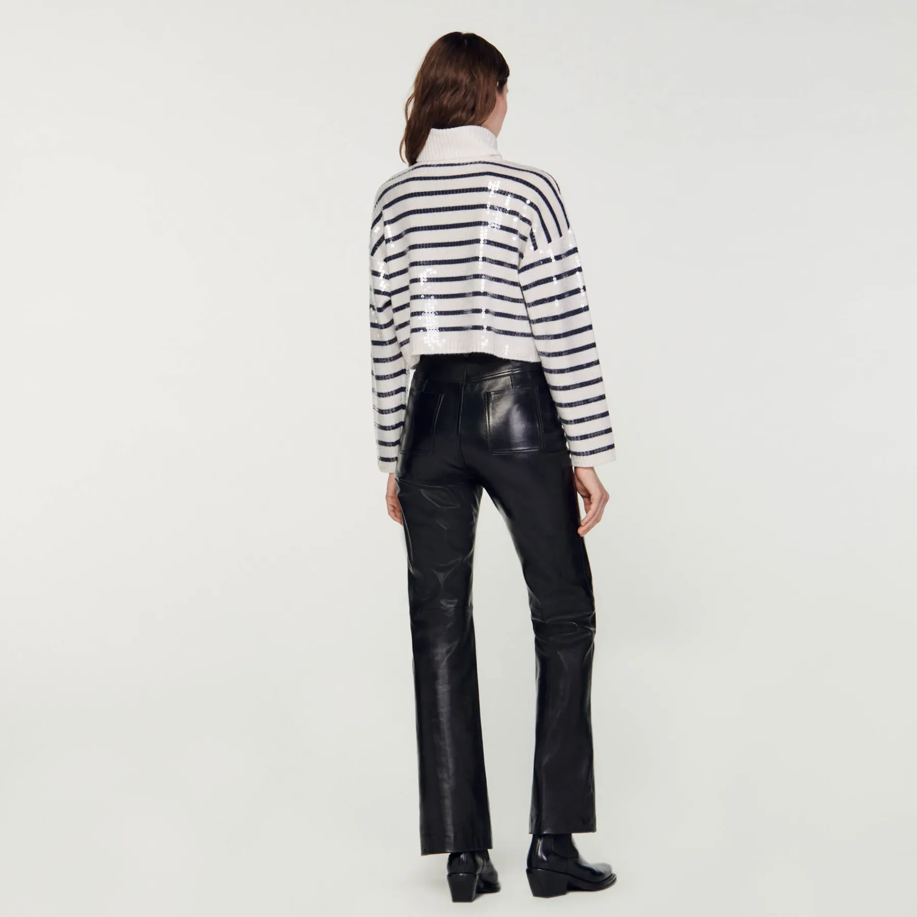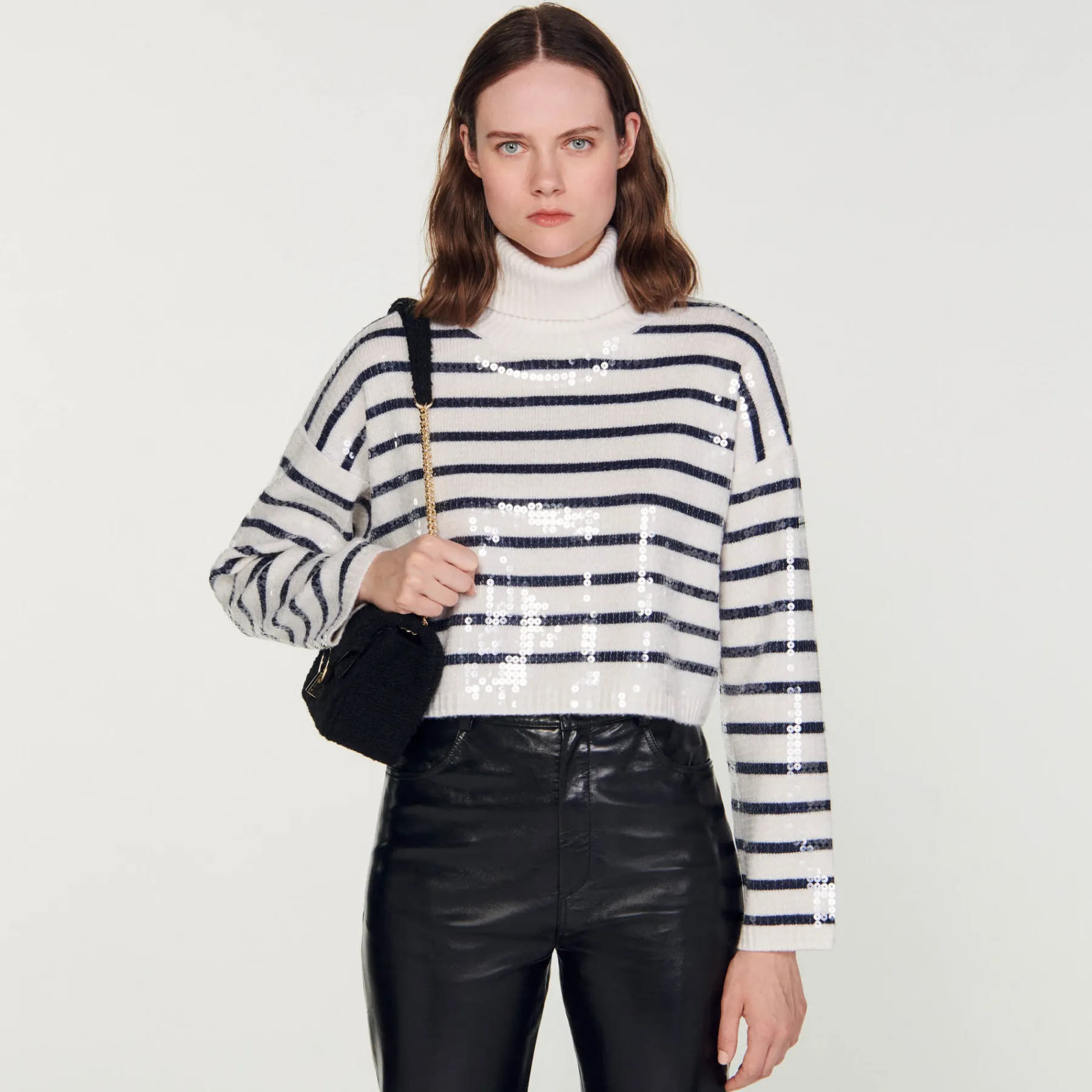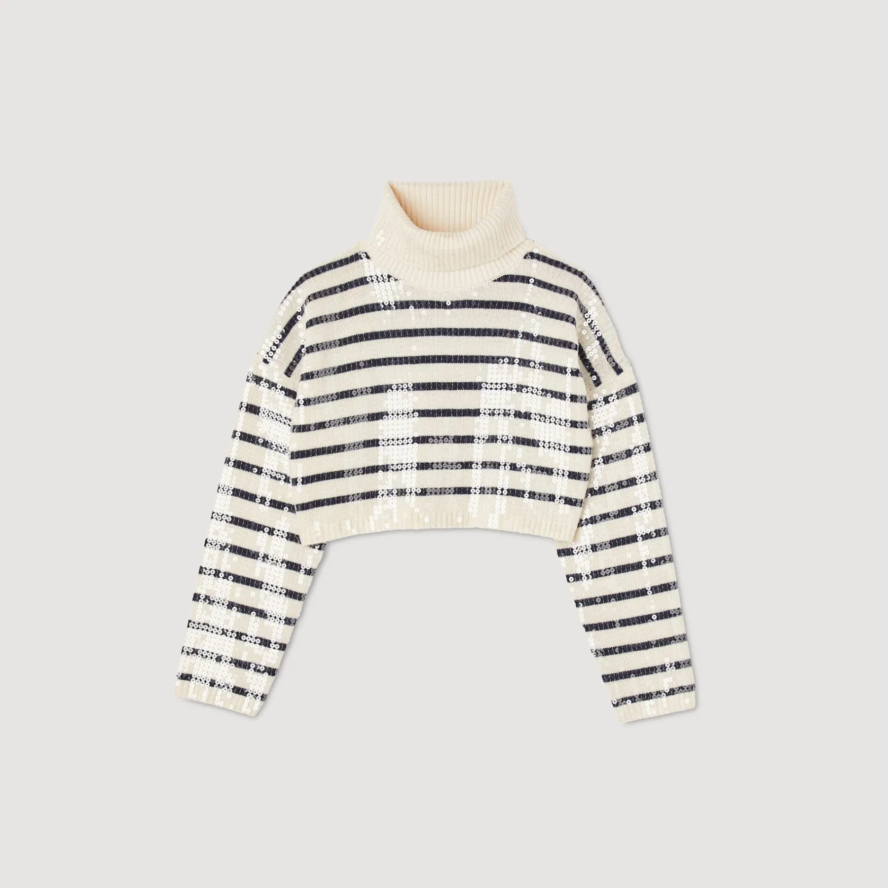Loe-fit cropped striped sweater made of wool and cashmere, with sequined turtleneck and long sleeves
