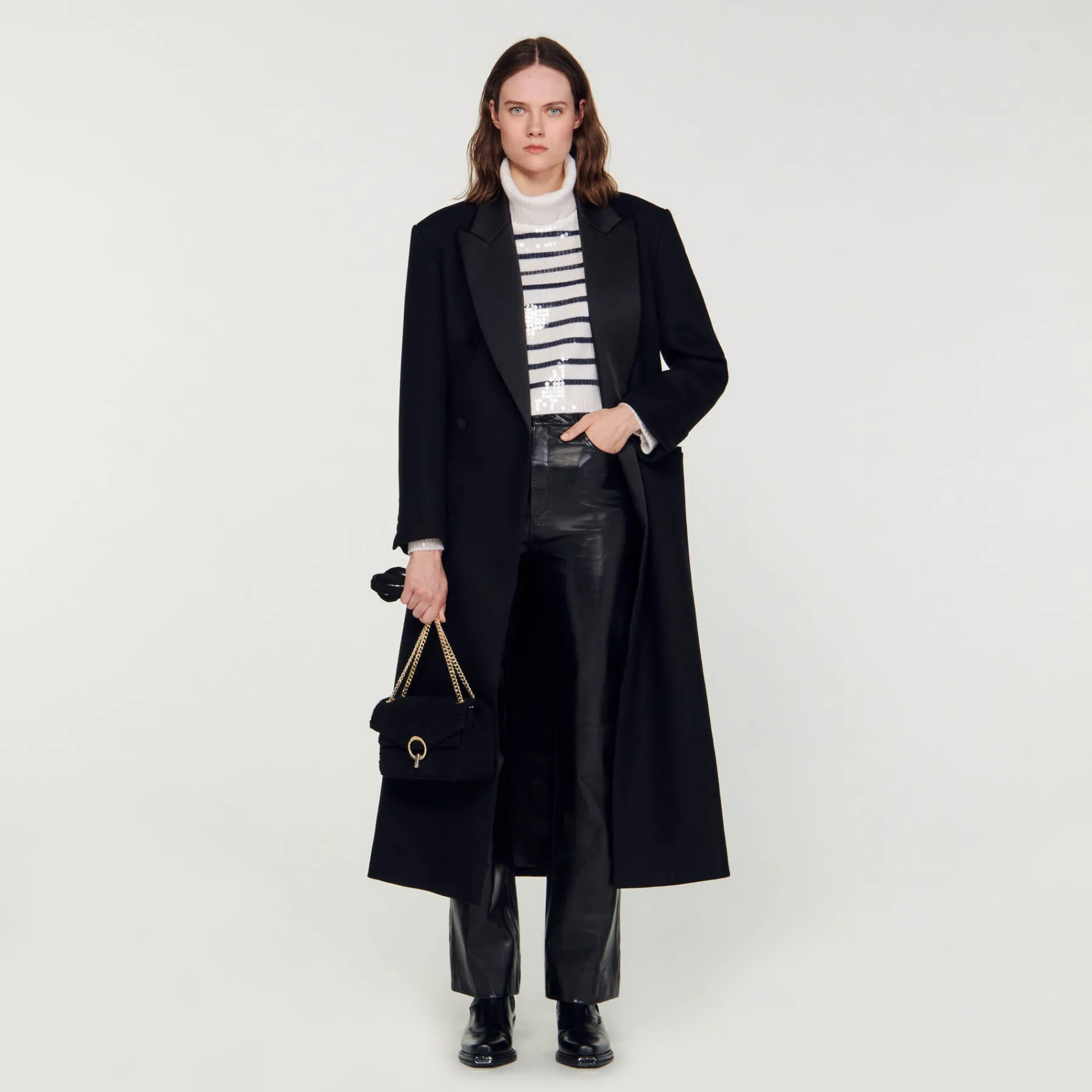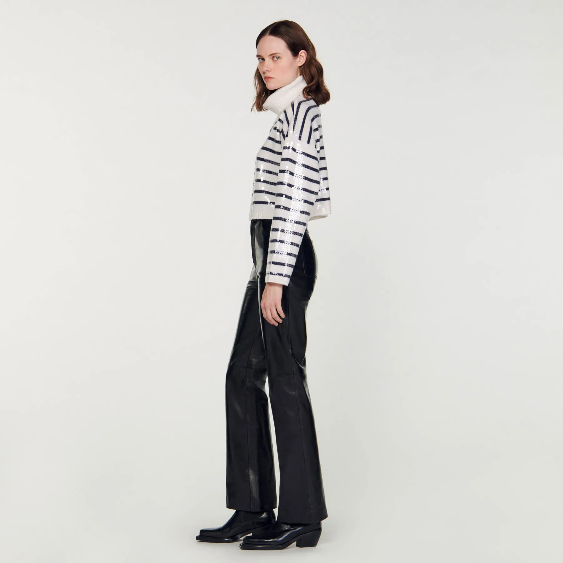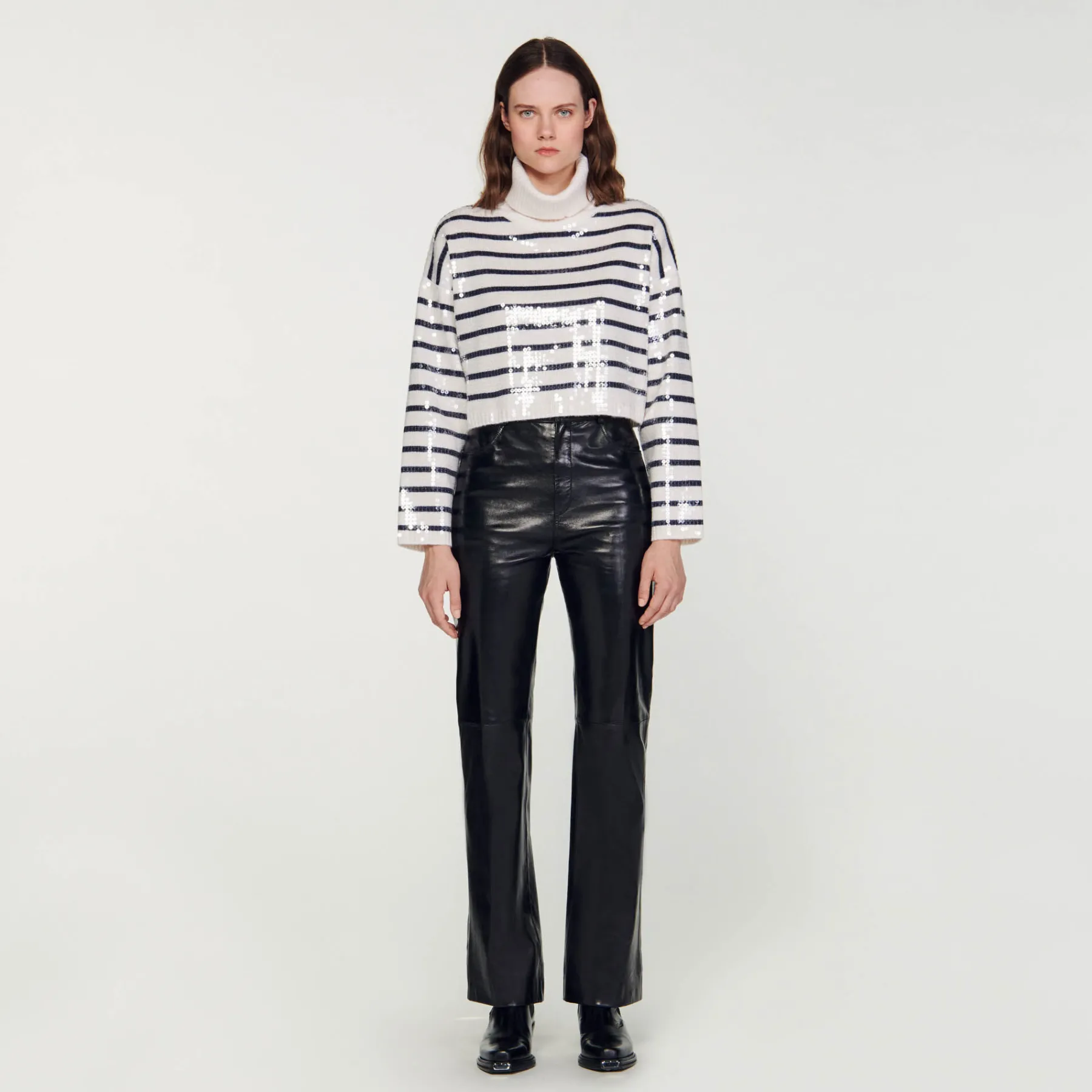 Loe-fit cropped striped sweater made of wool and cashmere, with sequined turtleneck and long sleeves