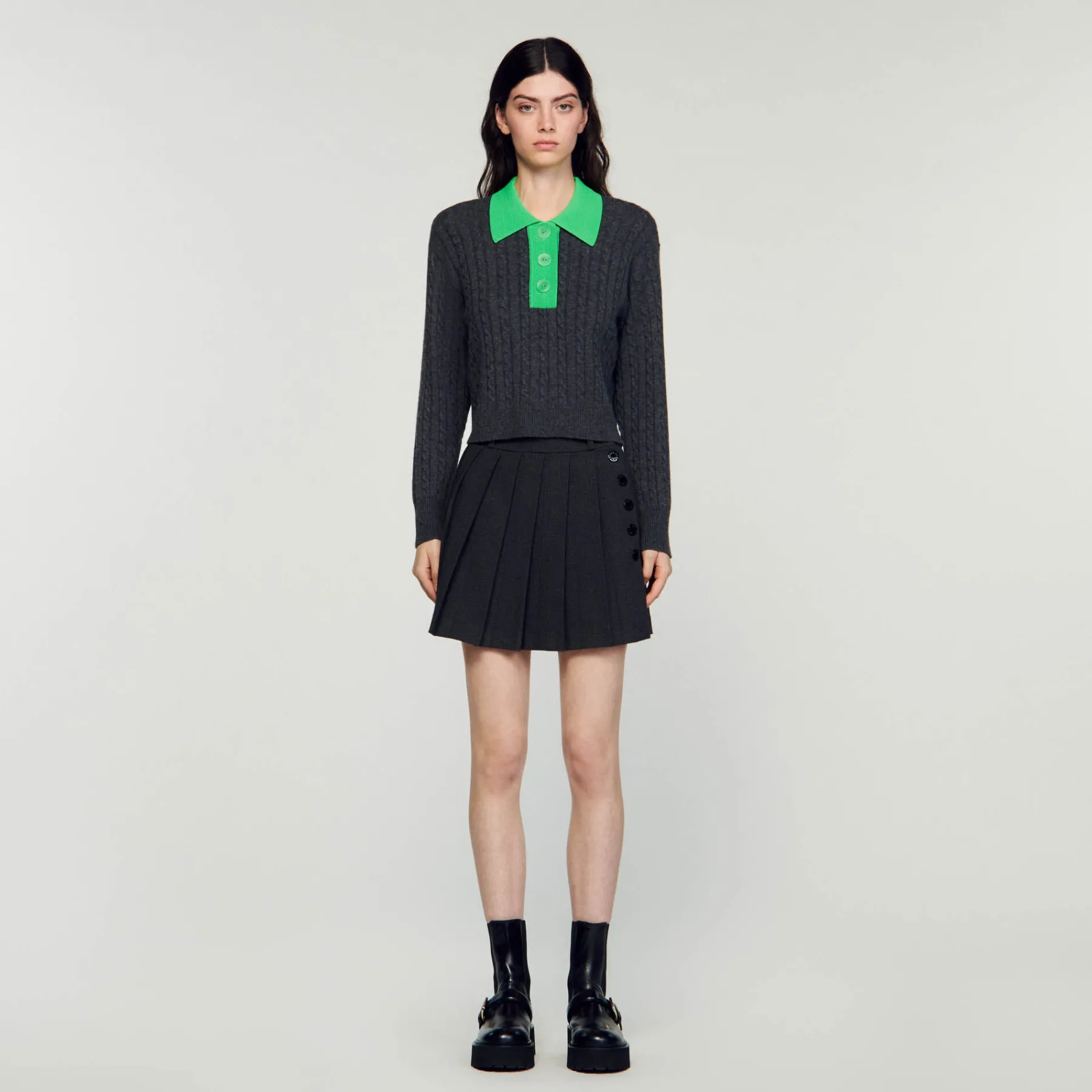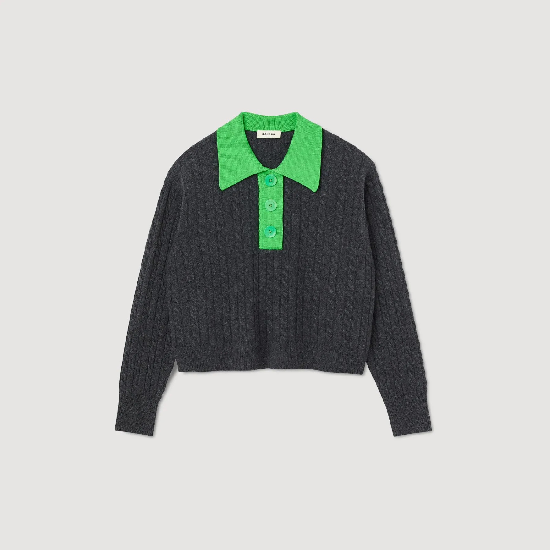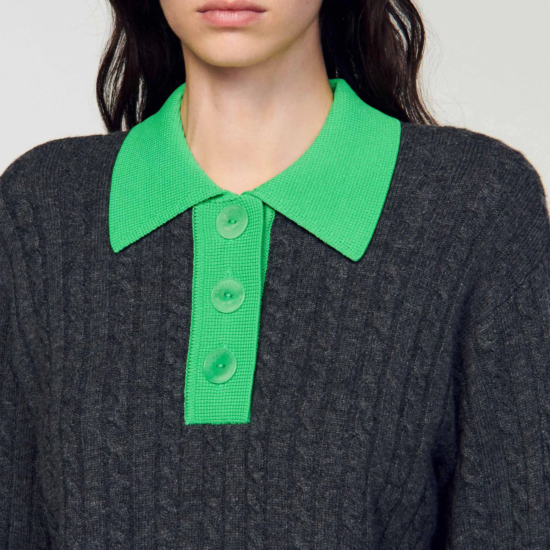 Cropped cable-knit sweater with contrasting 3-button polo collar and long sleeves.