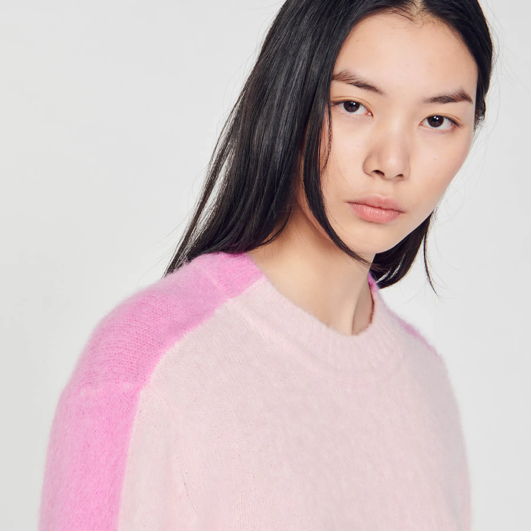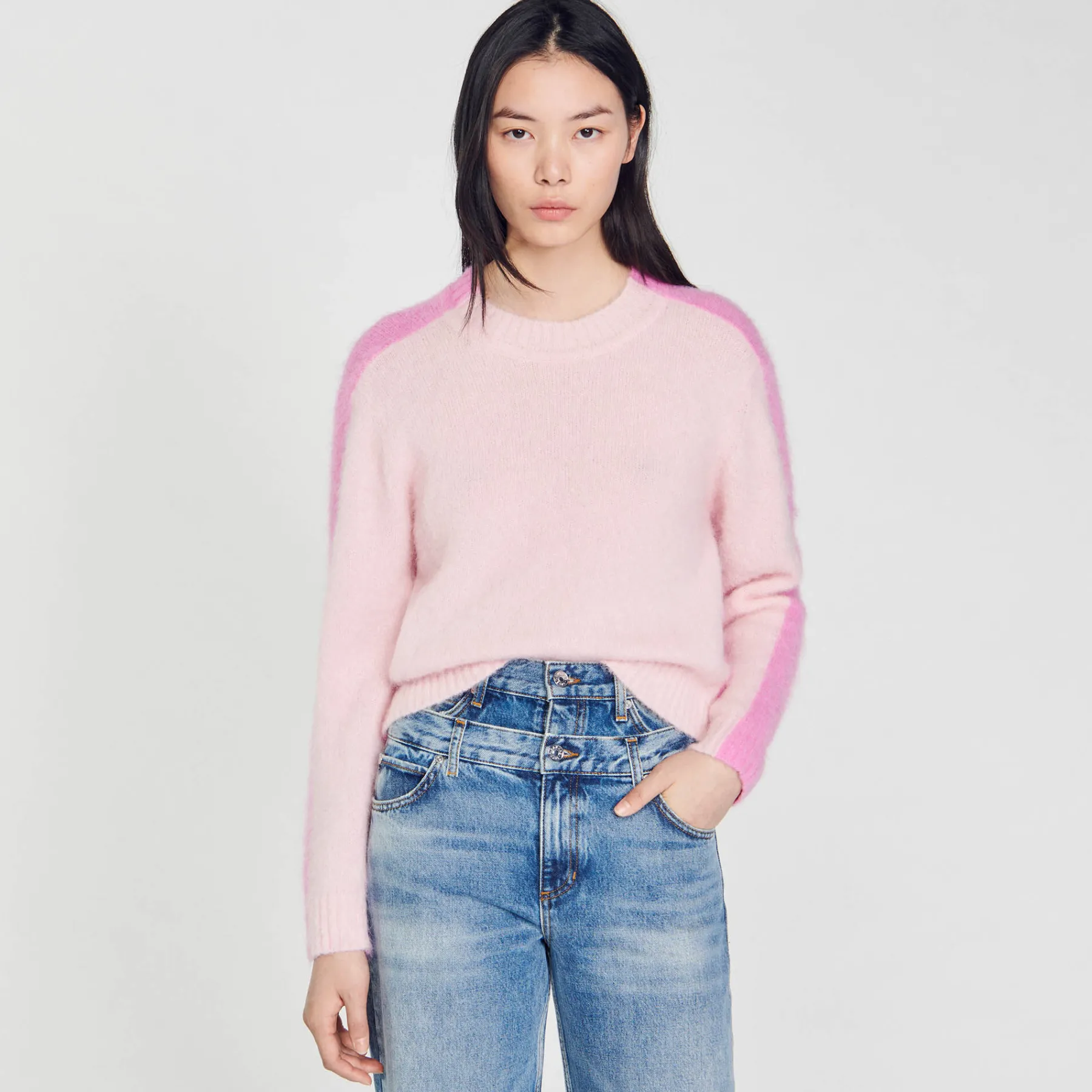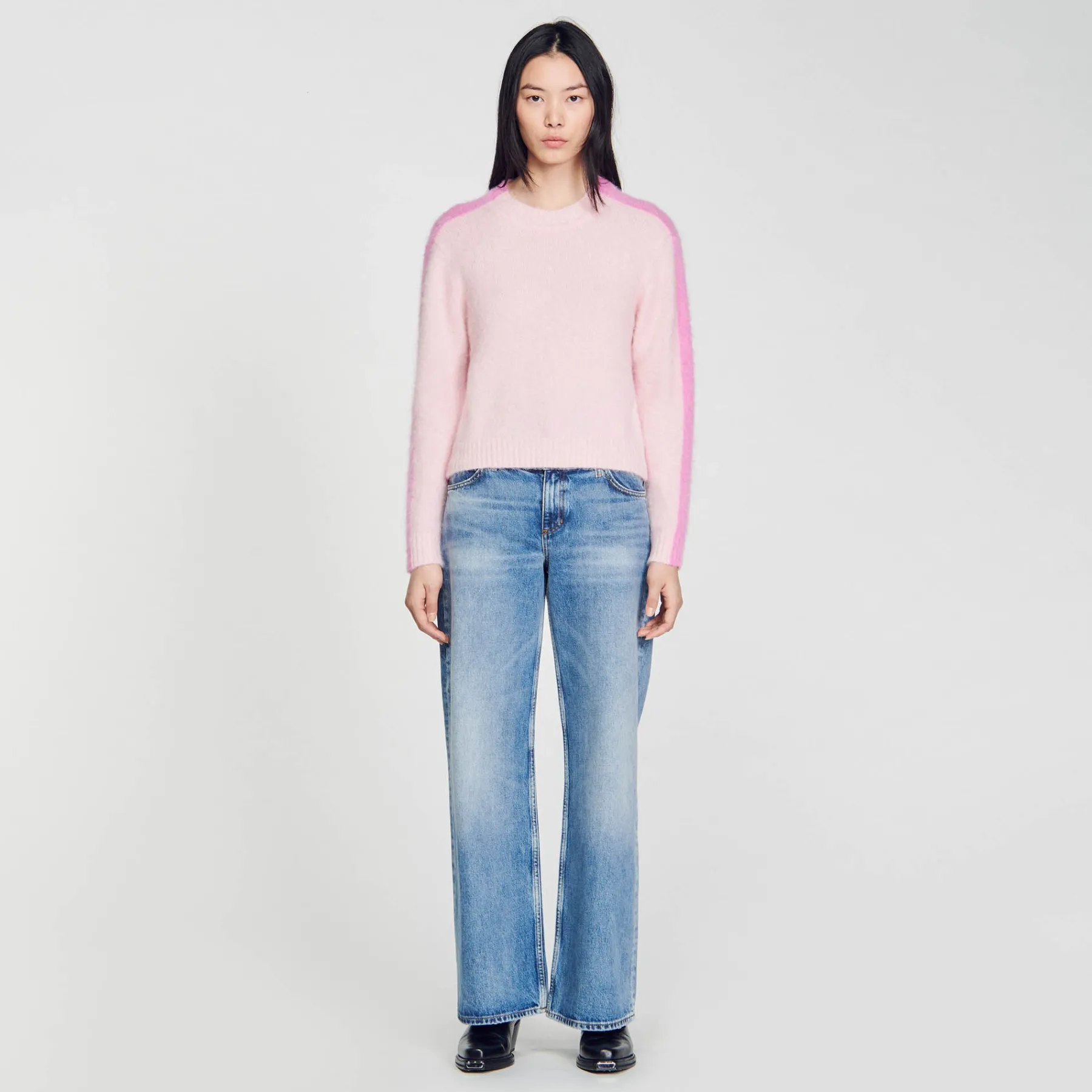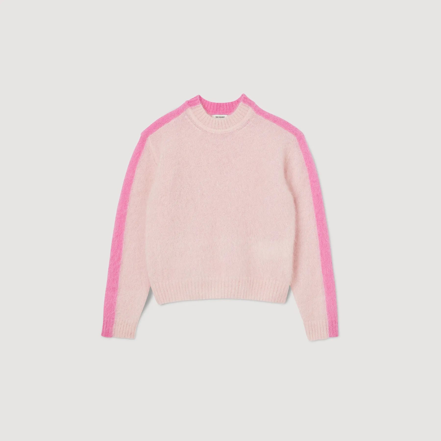 Fluffy knit sweater with round neck and long sleeves embellished with contrasting stripes along the sleeves.