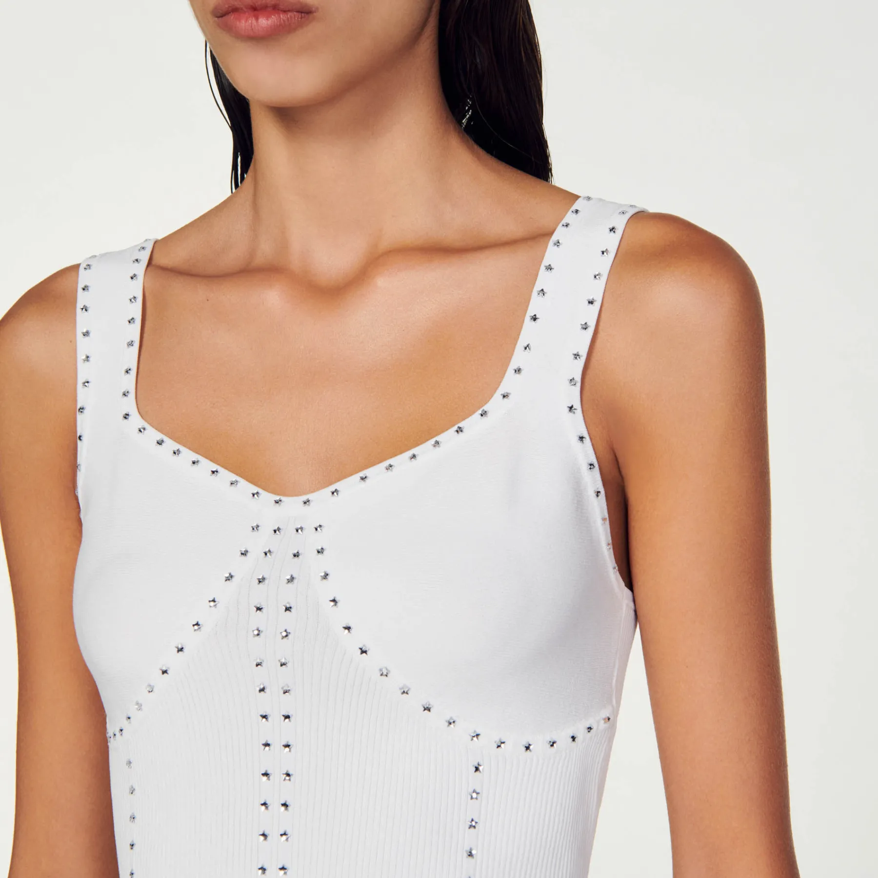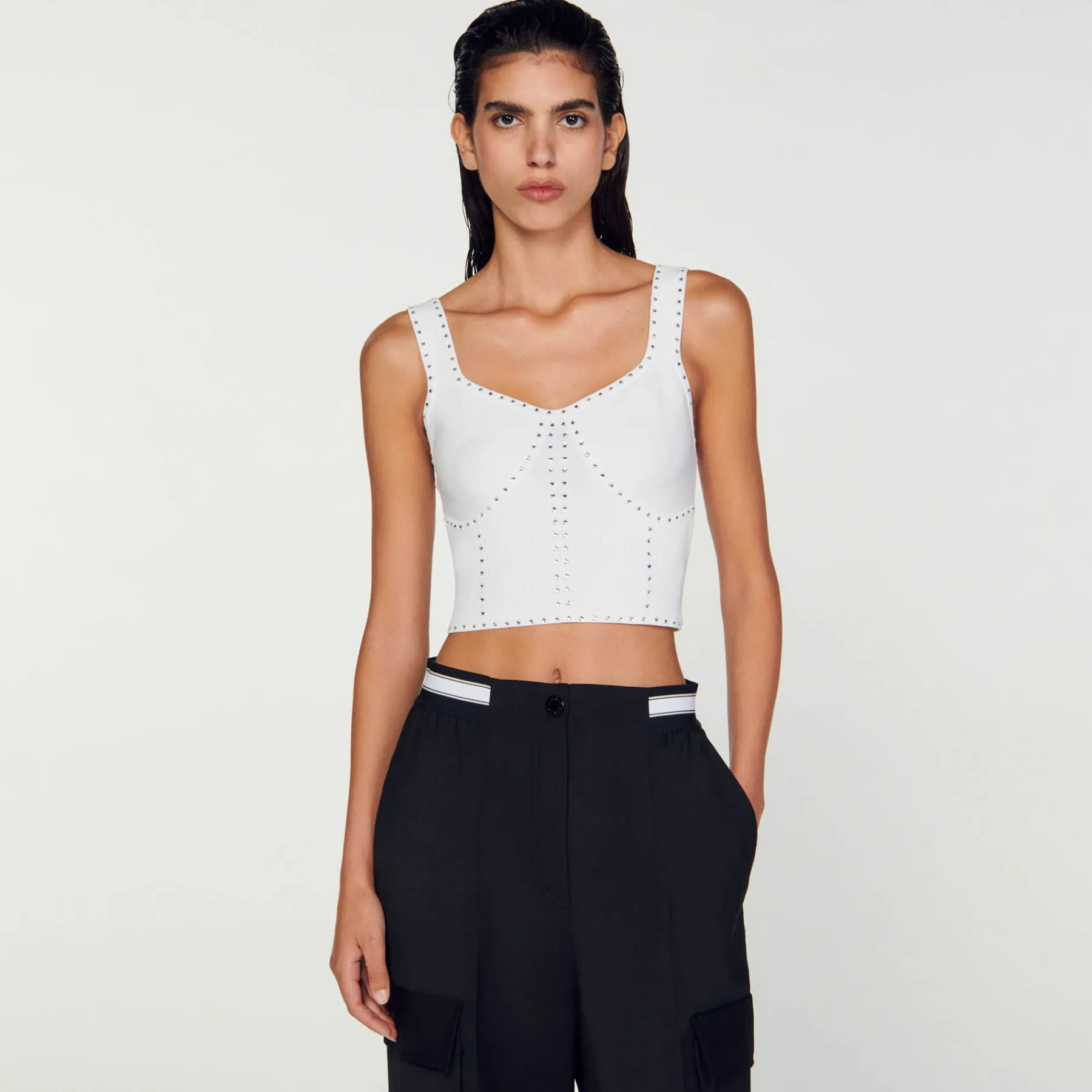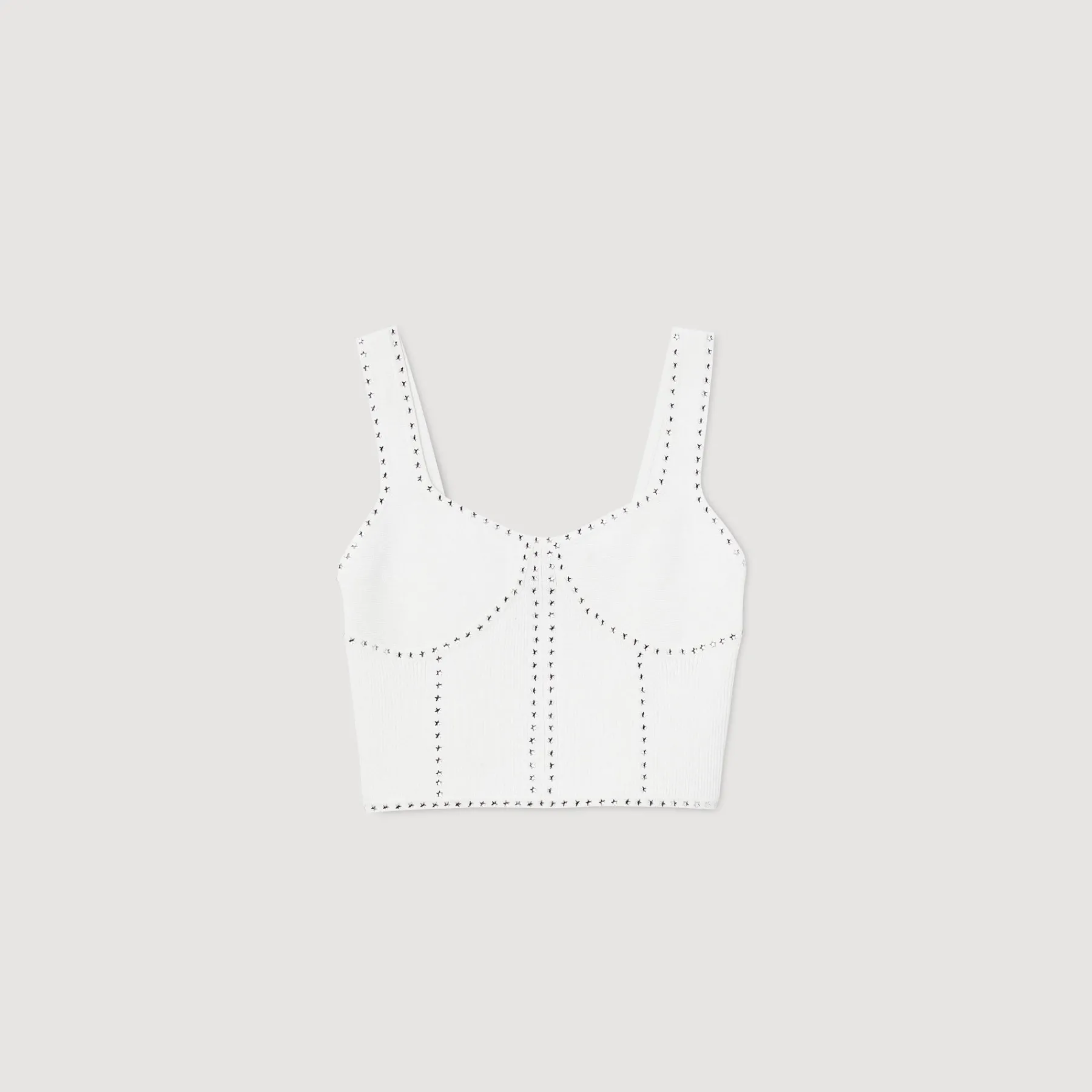 Cropped ribbed knit top with wide straps and rhinestone embellishment in a corset shape.