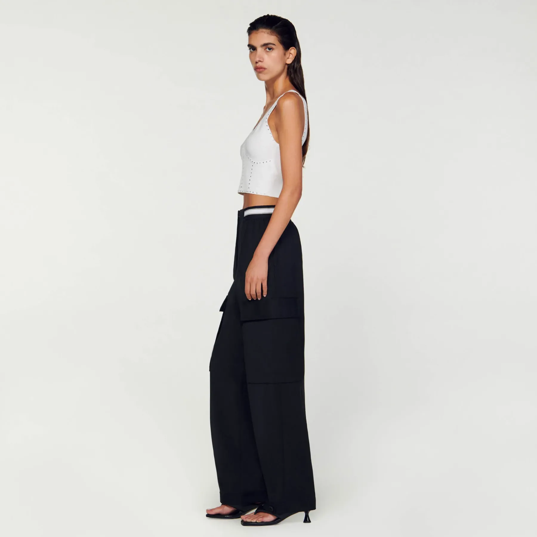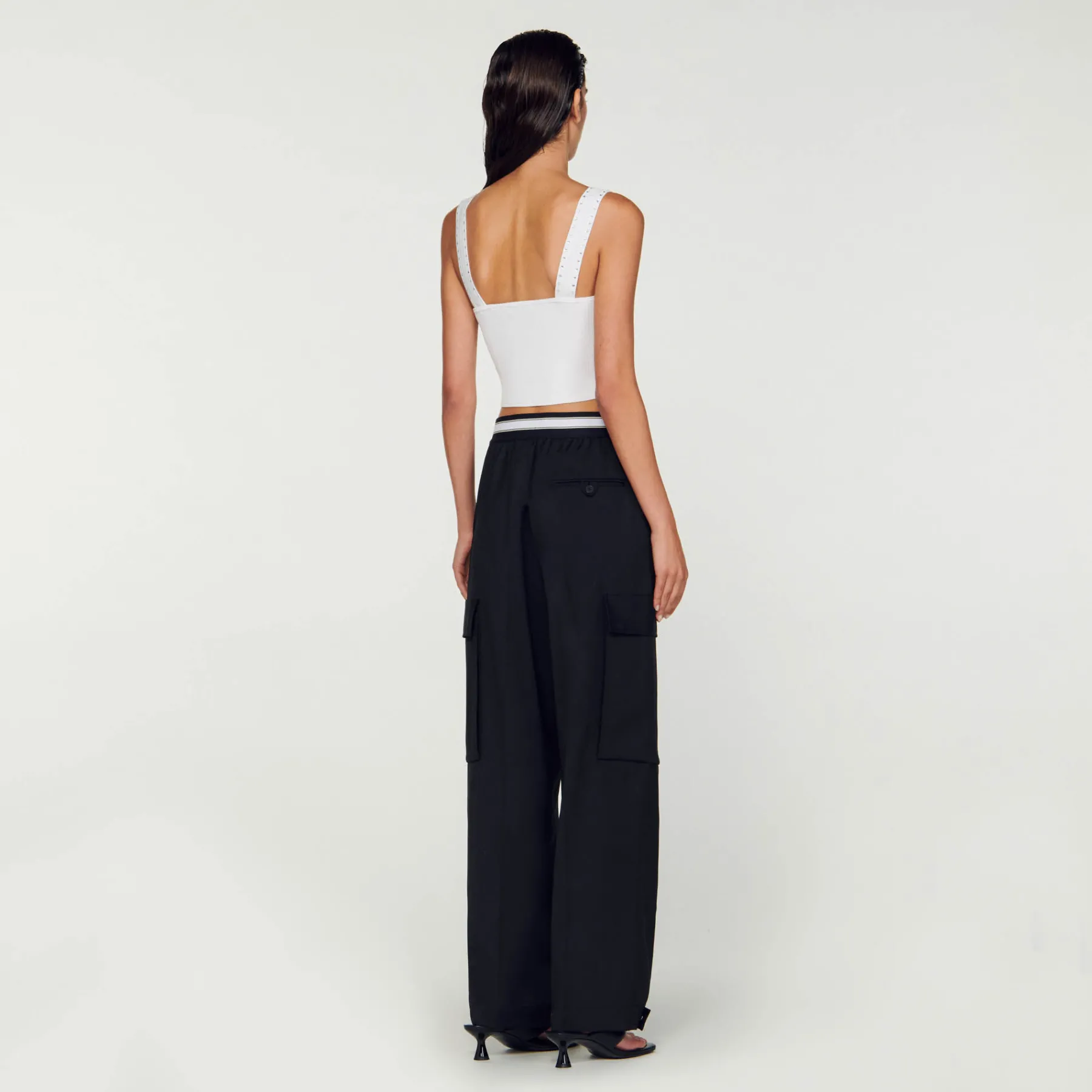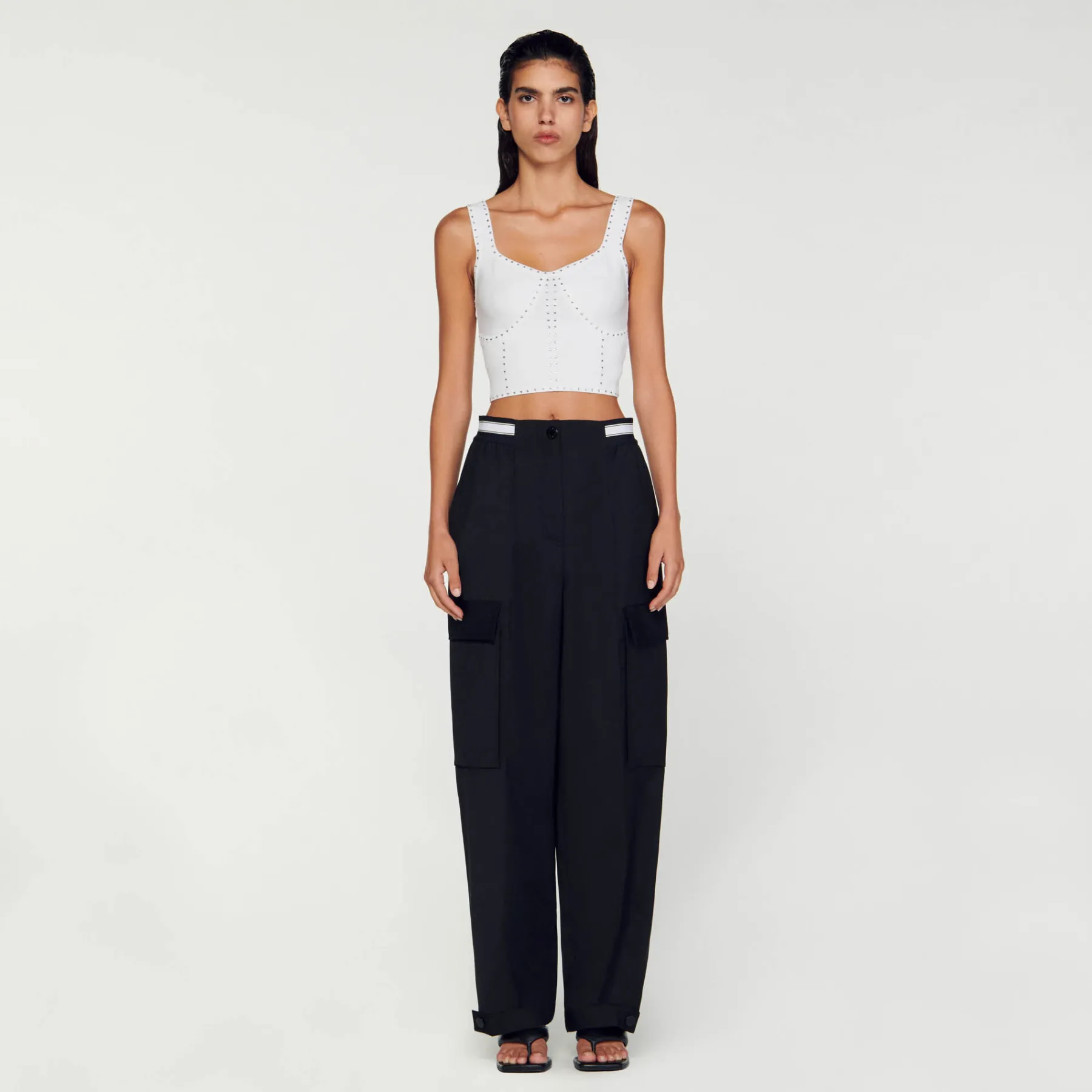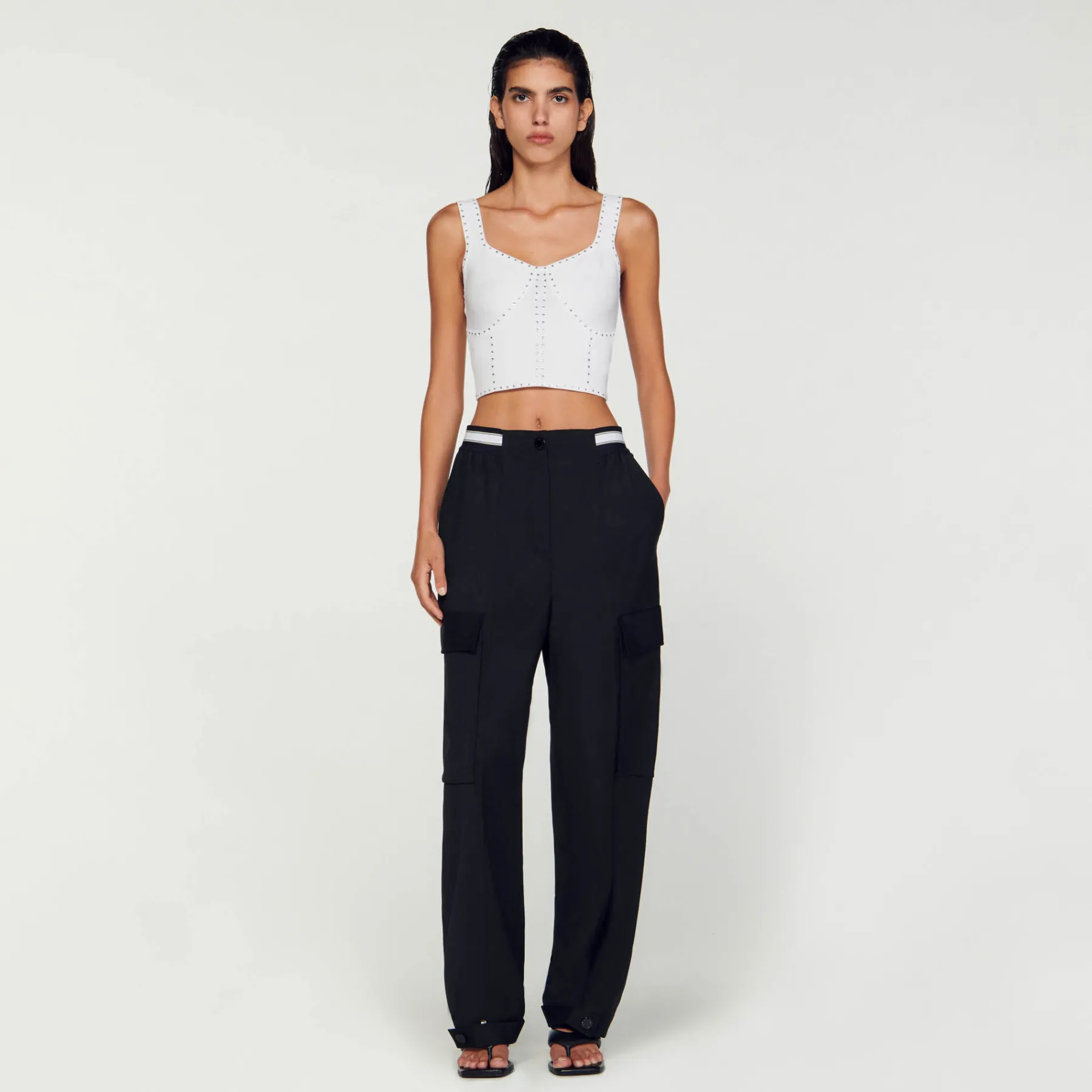 Cropped ribbed knit top with wide straps and rhinestone embellishment in a corset shape.