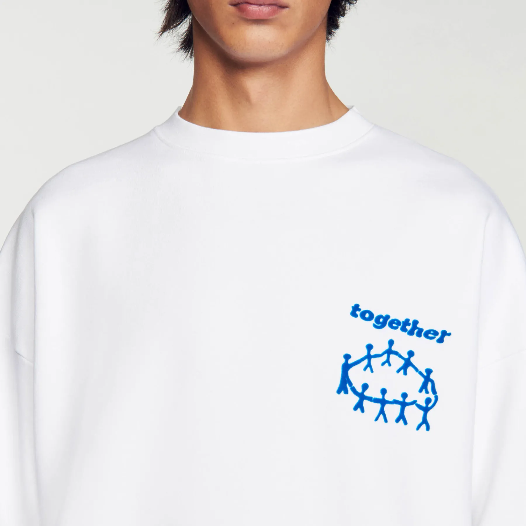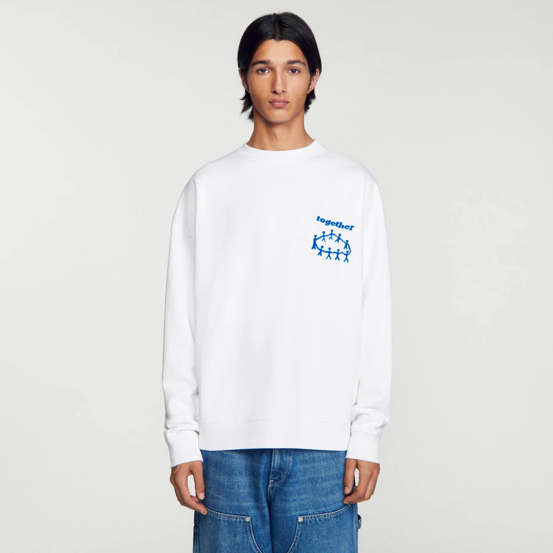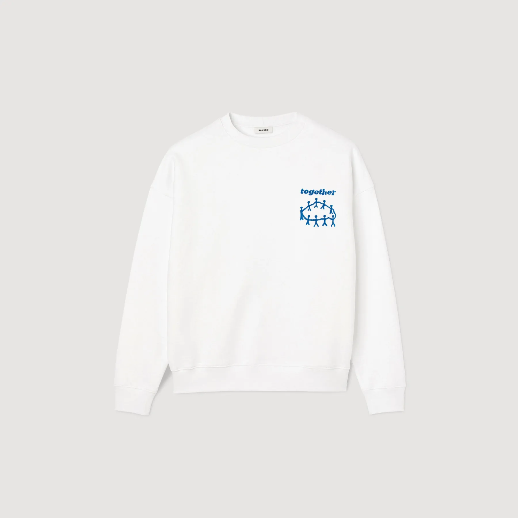 Round-neck, long-sleeved sweatshirt in brushed fleece, featuring Flock Together on the chest.