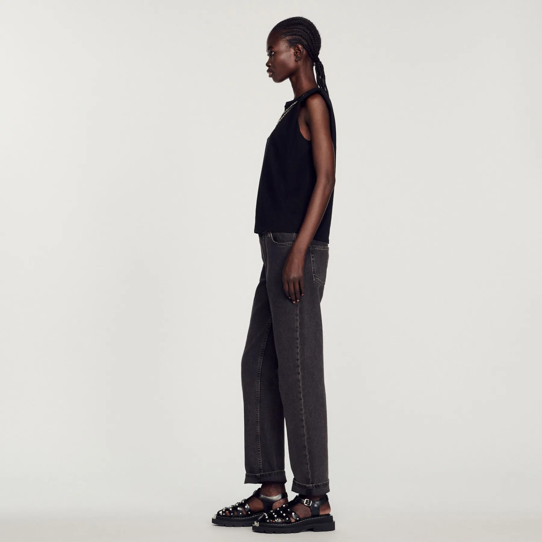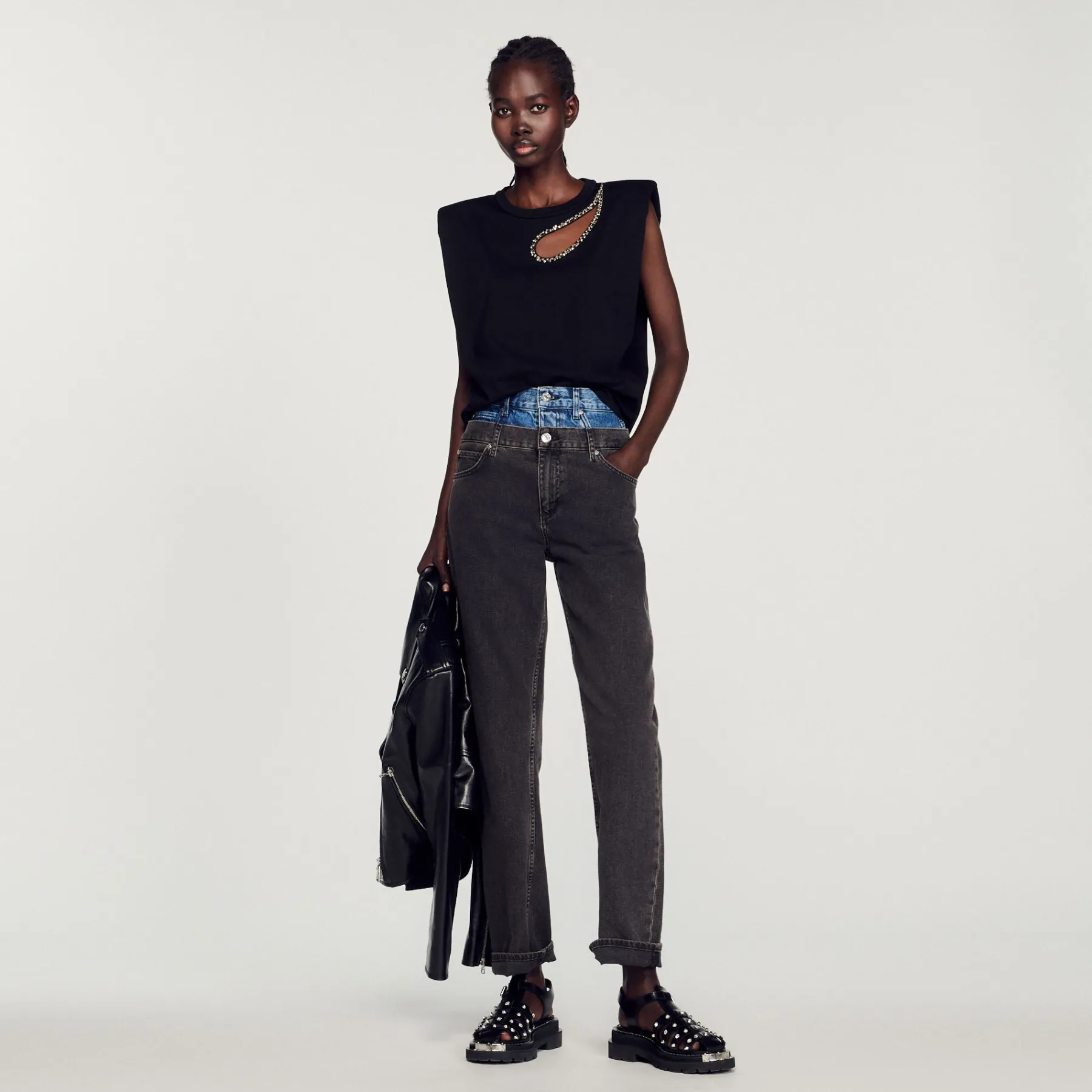 Sleeveless T-shirt with a round neck and shoulder pads, decorated with an asymmetrical openwork teardrop trimmed with crystals.