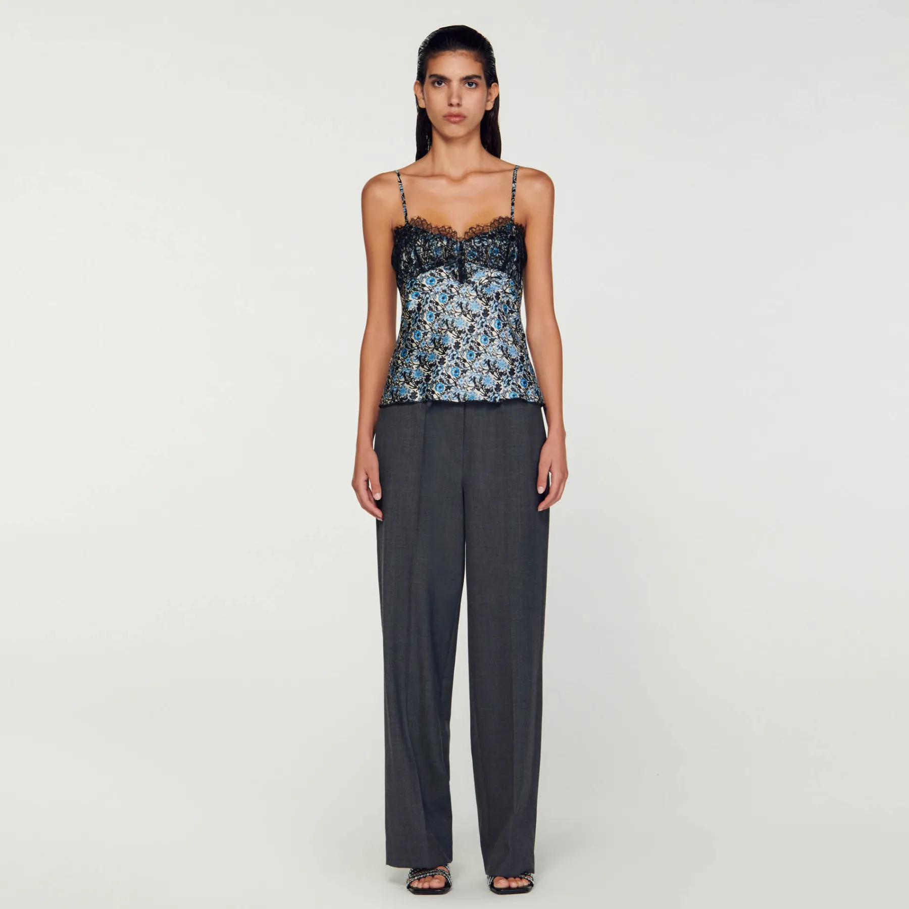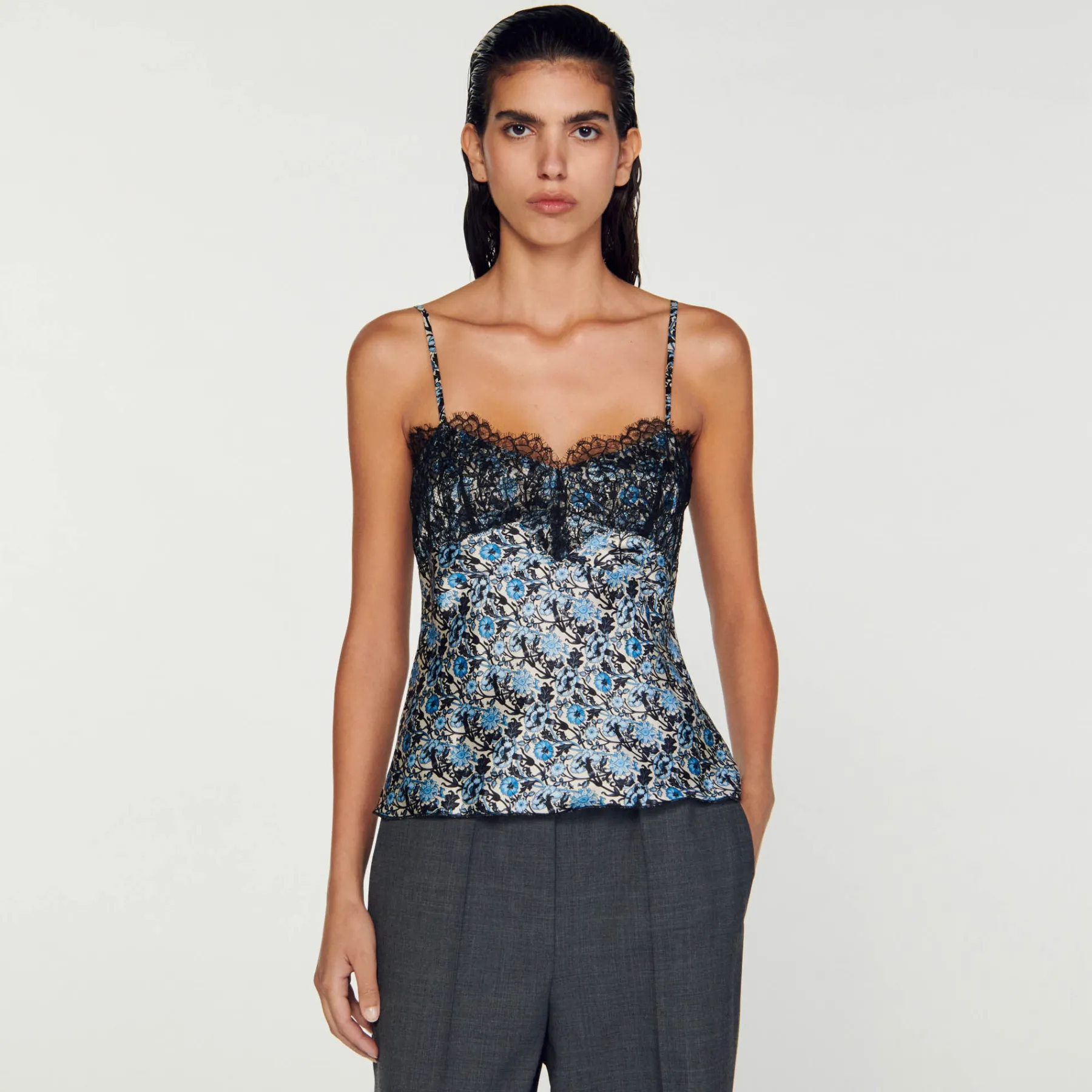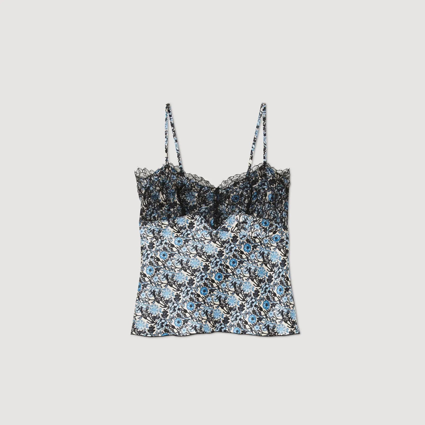 Printed flowing camisole with thin straps and a contrasting lace neckline.
