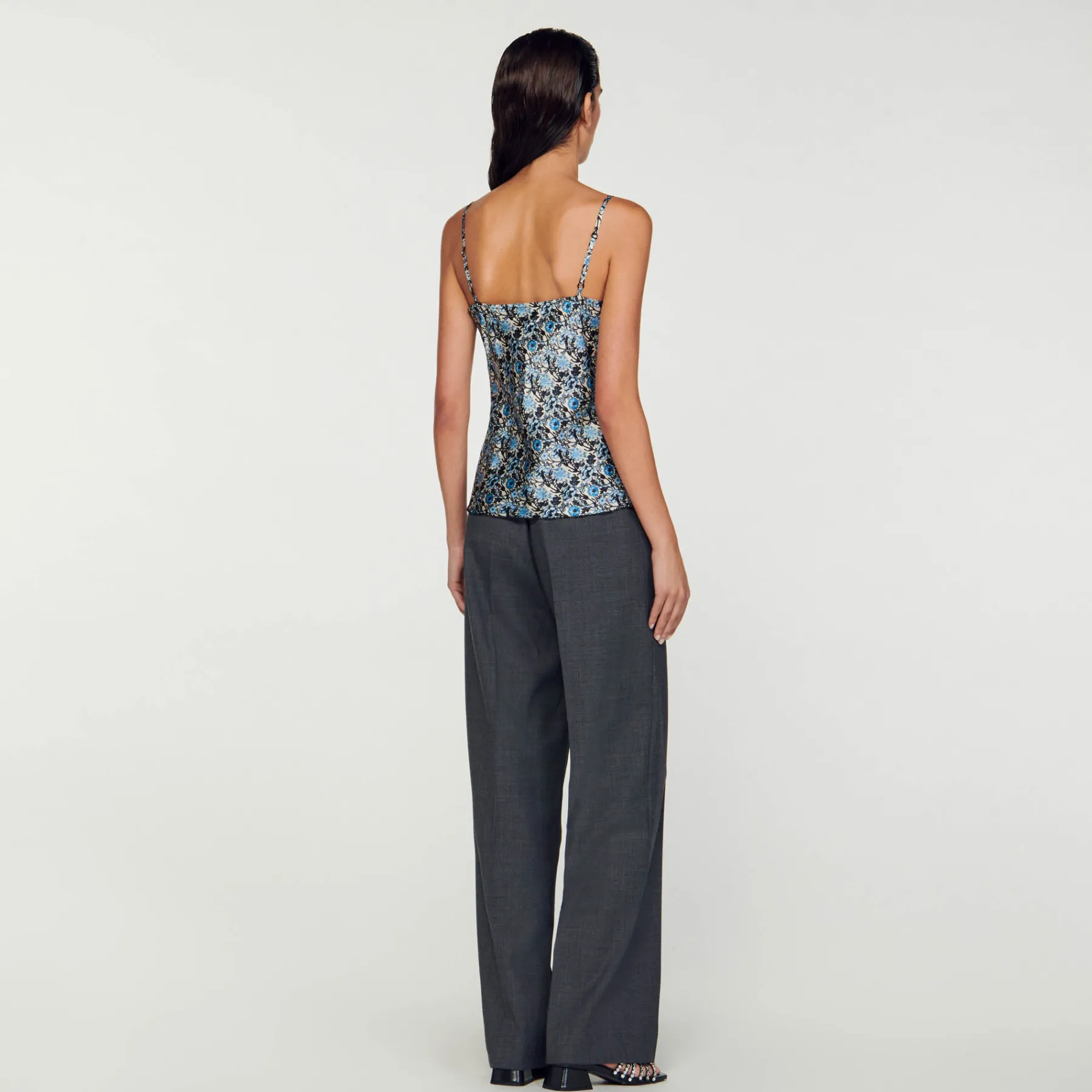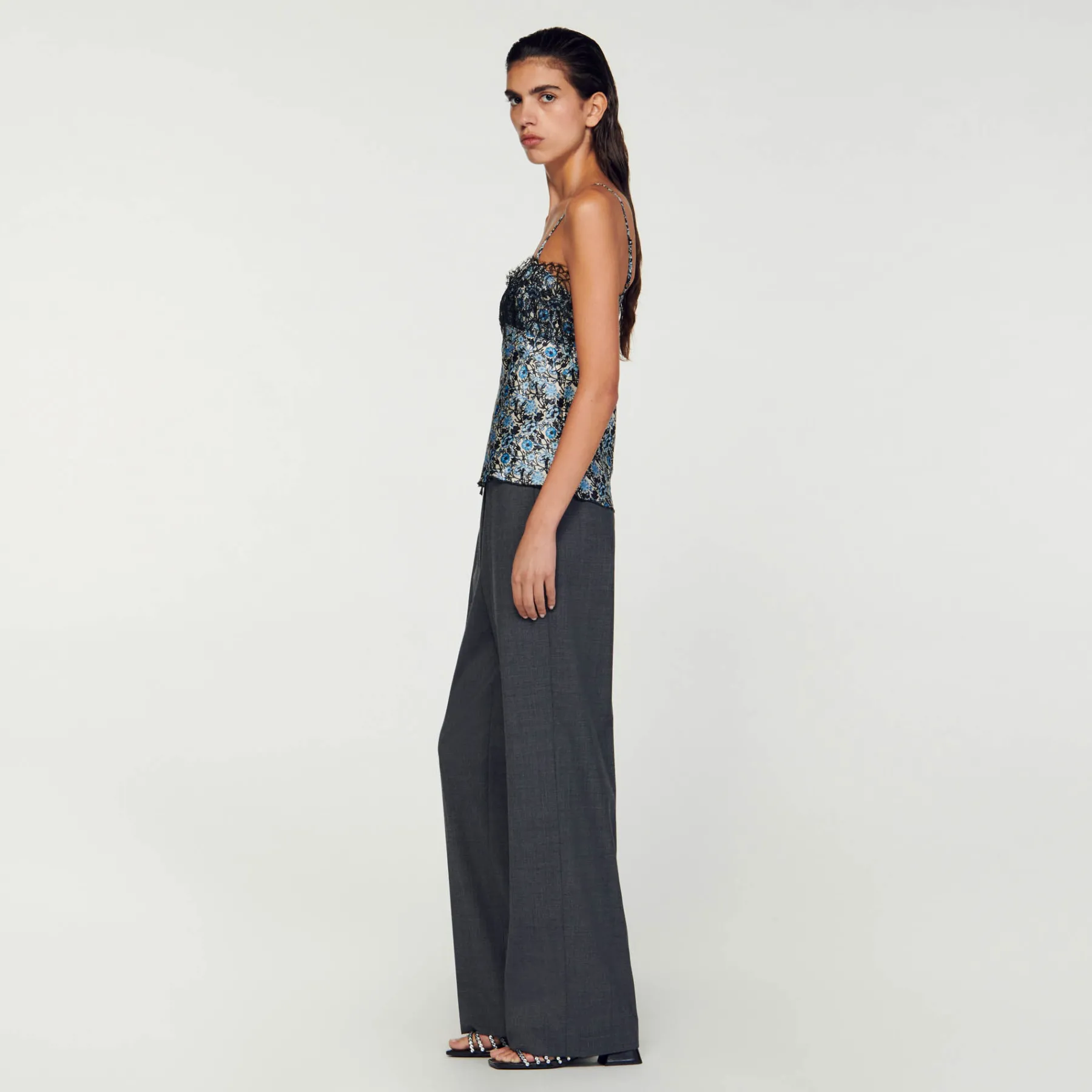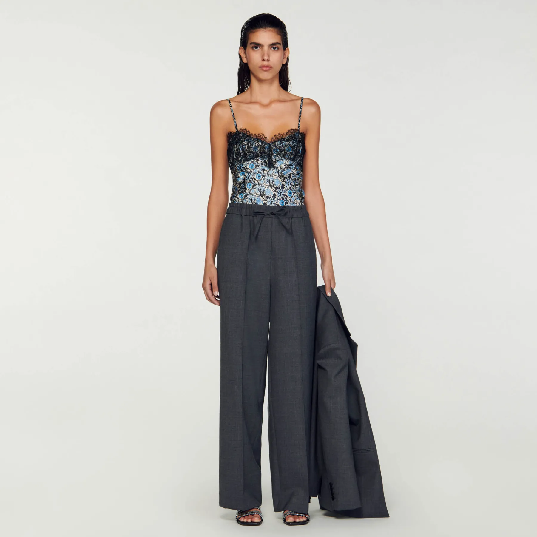Printed flowing camisole with thin straps and a contrasting lace neckline.