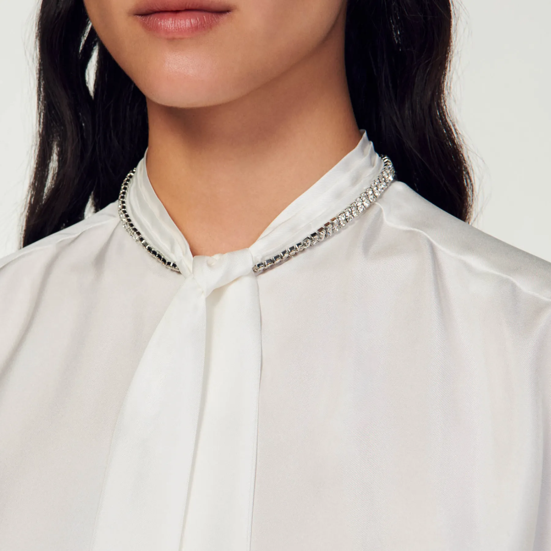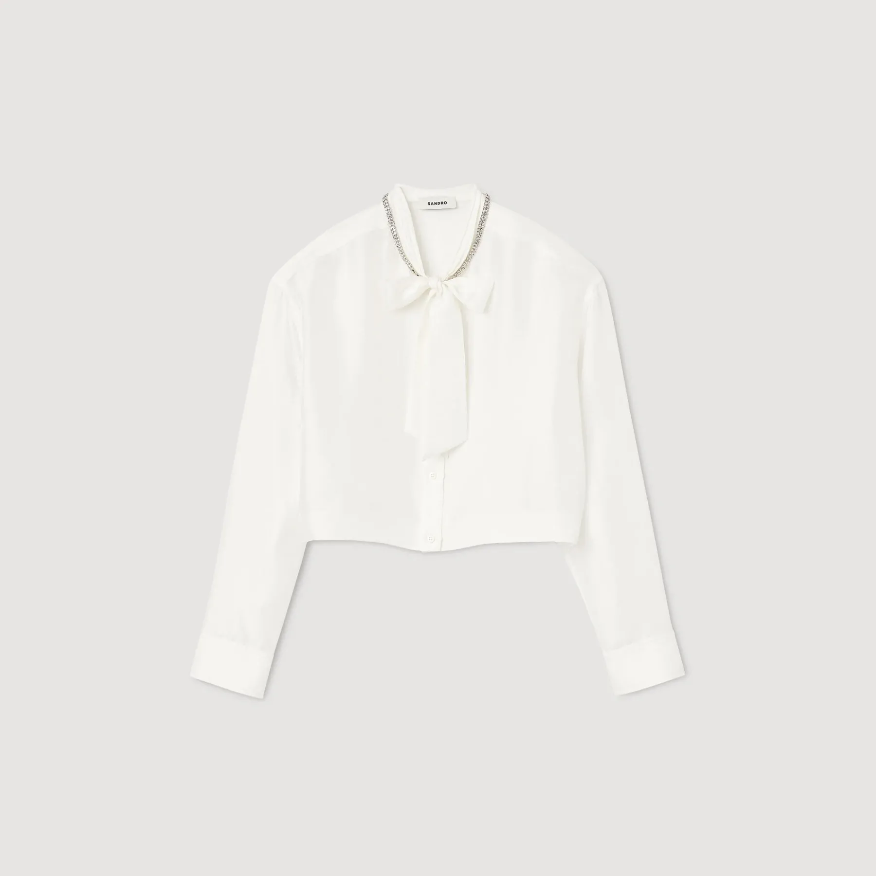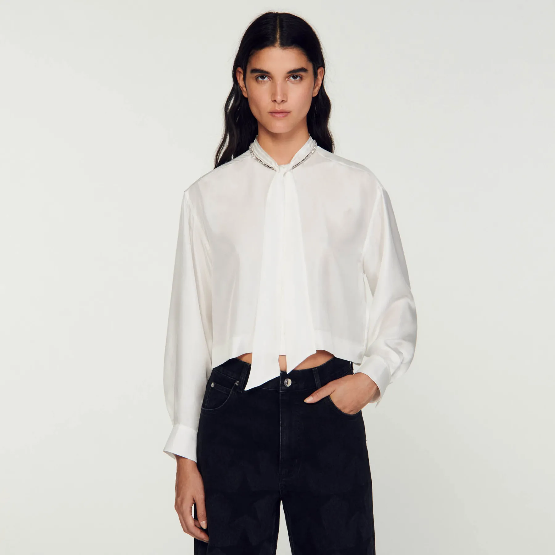 Short silk twill shirt with long sleeves, a tie neck adorned with rhinestones, and topstitched details.