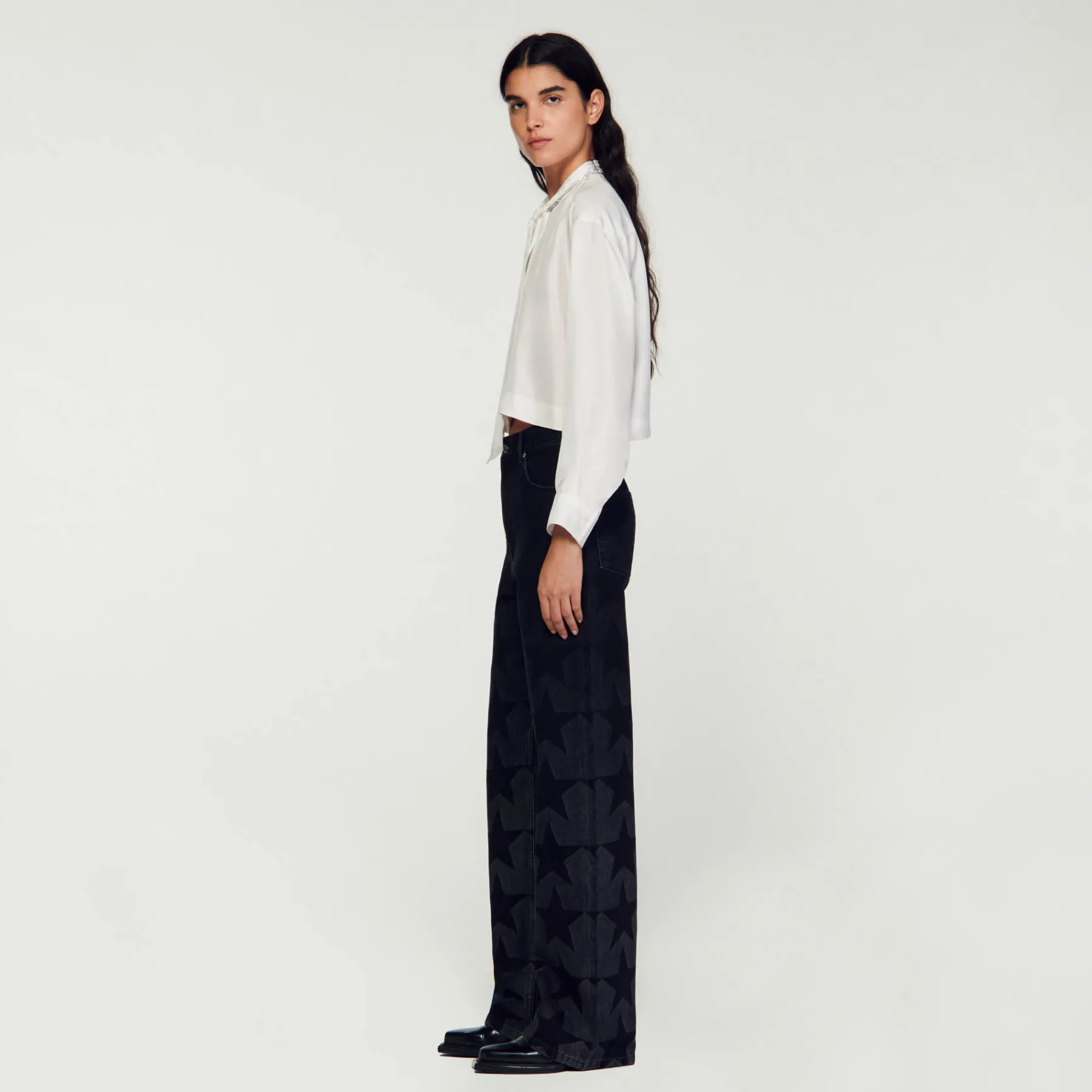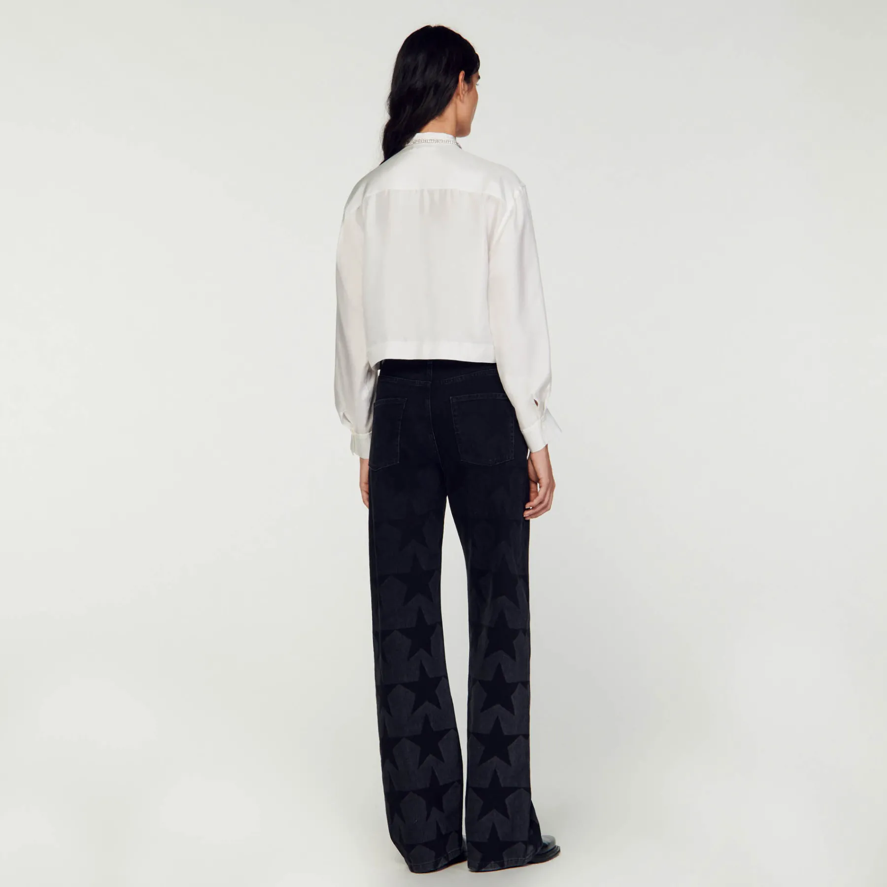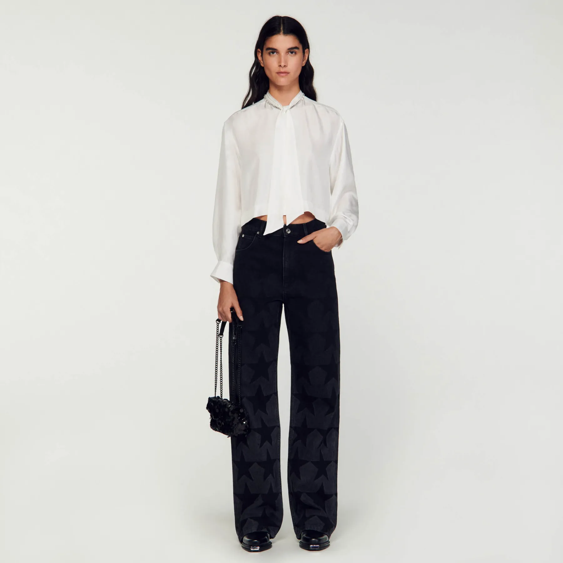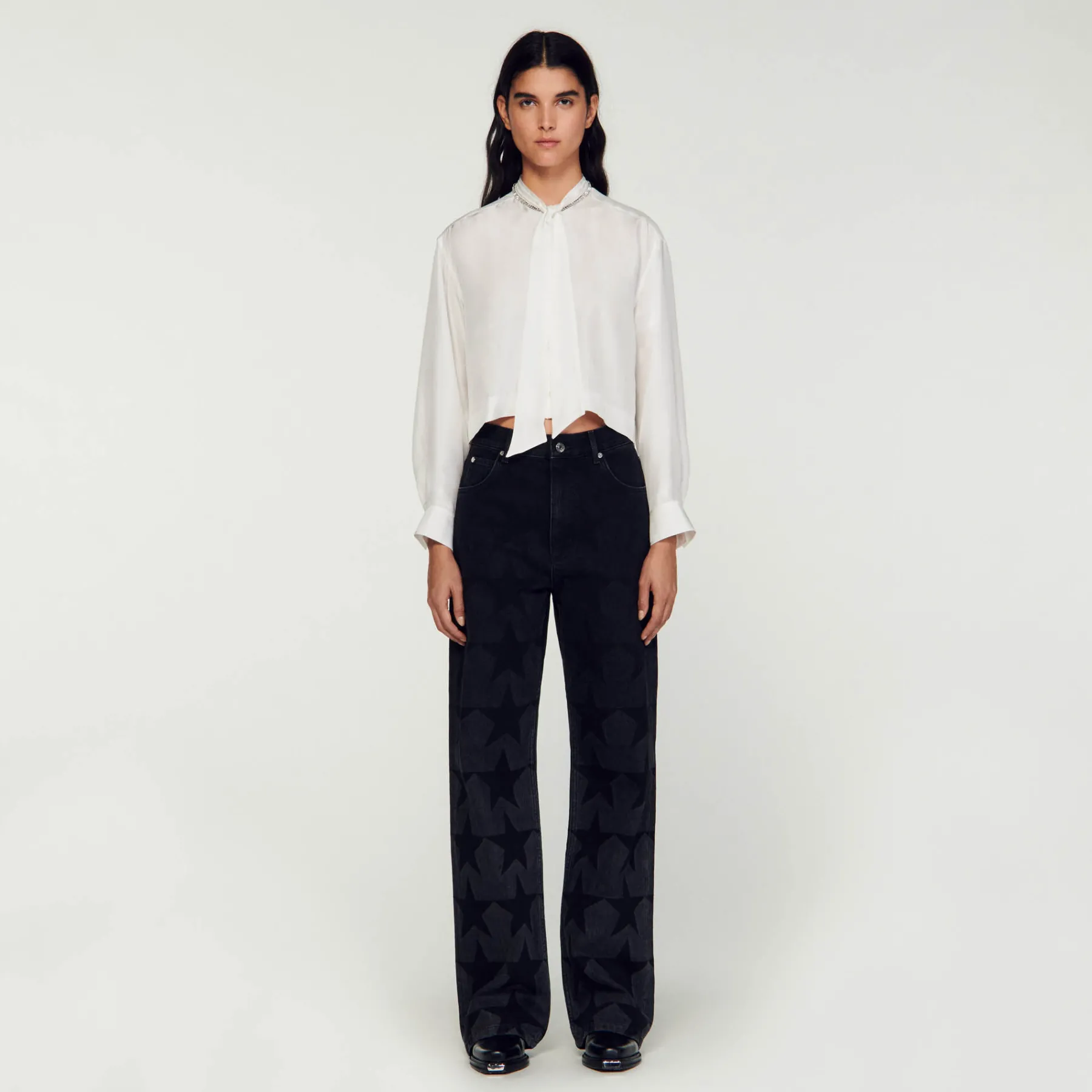 Short silk twill shirt with long sleeves, a tie neck adorned with rhinestones, and topstitched details.