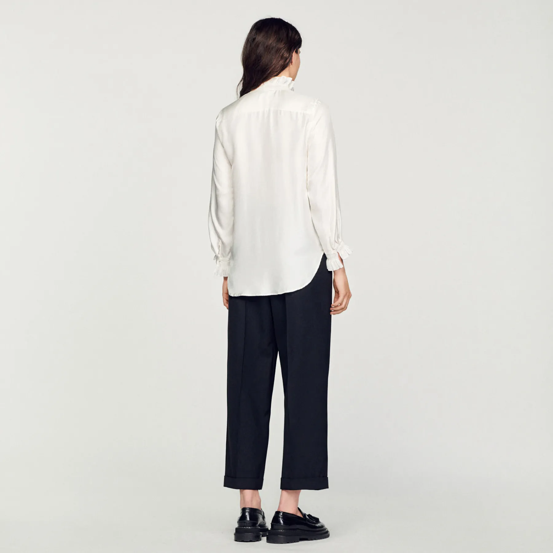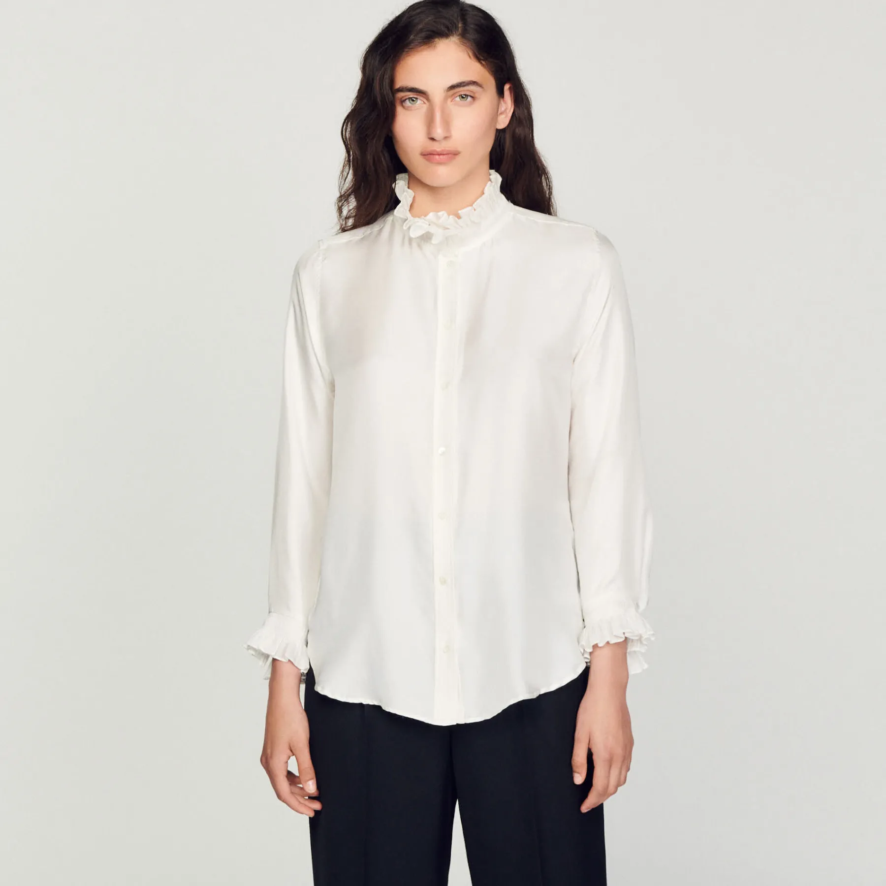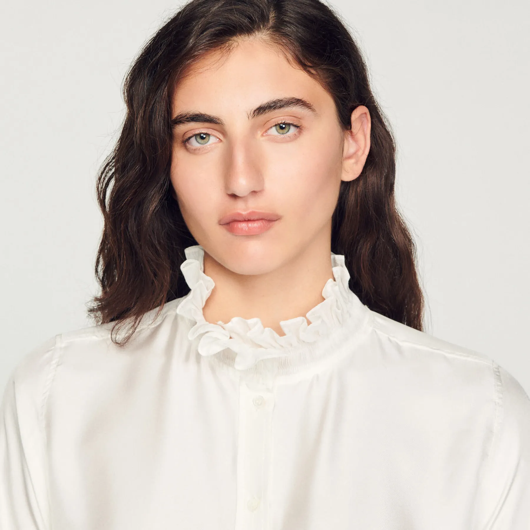 Sandro women’s shirt • Silk floaty shirt • Smocked-effect gathered collar • Long sleeves with gathered cuffs • Rounded asymmetric hem The model is 5’10” tall and wears a size 1 FR / 4 US