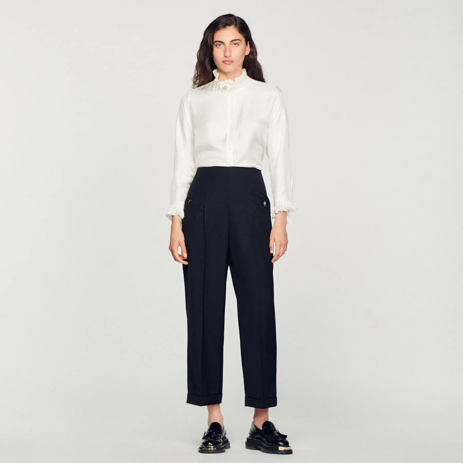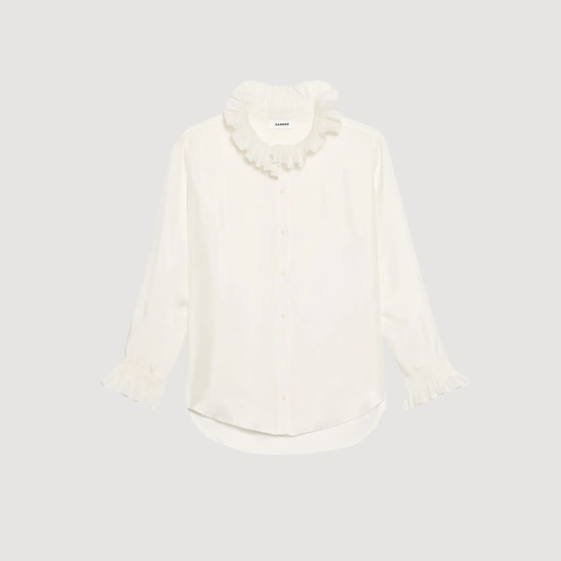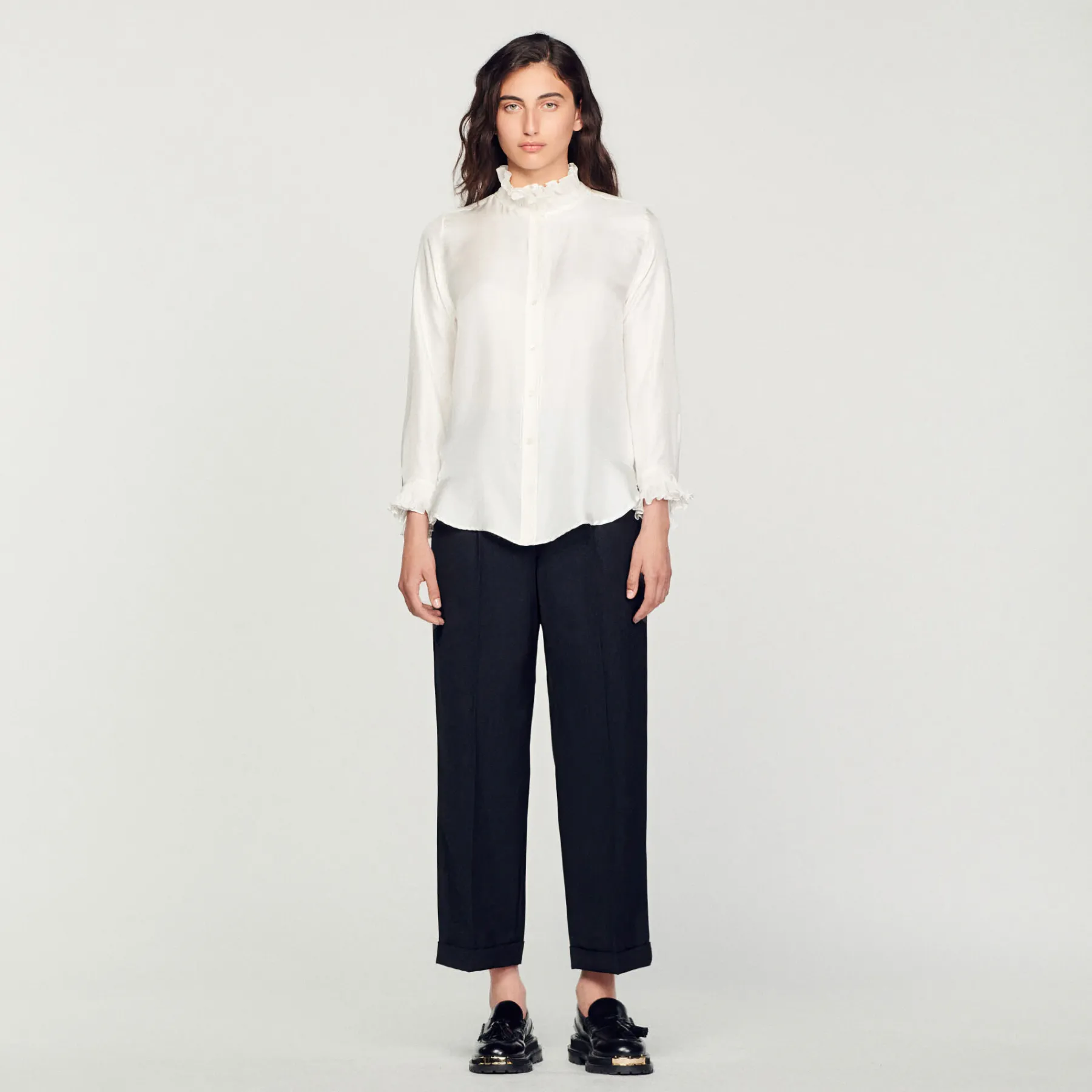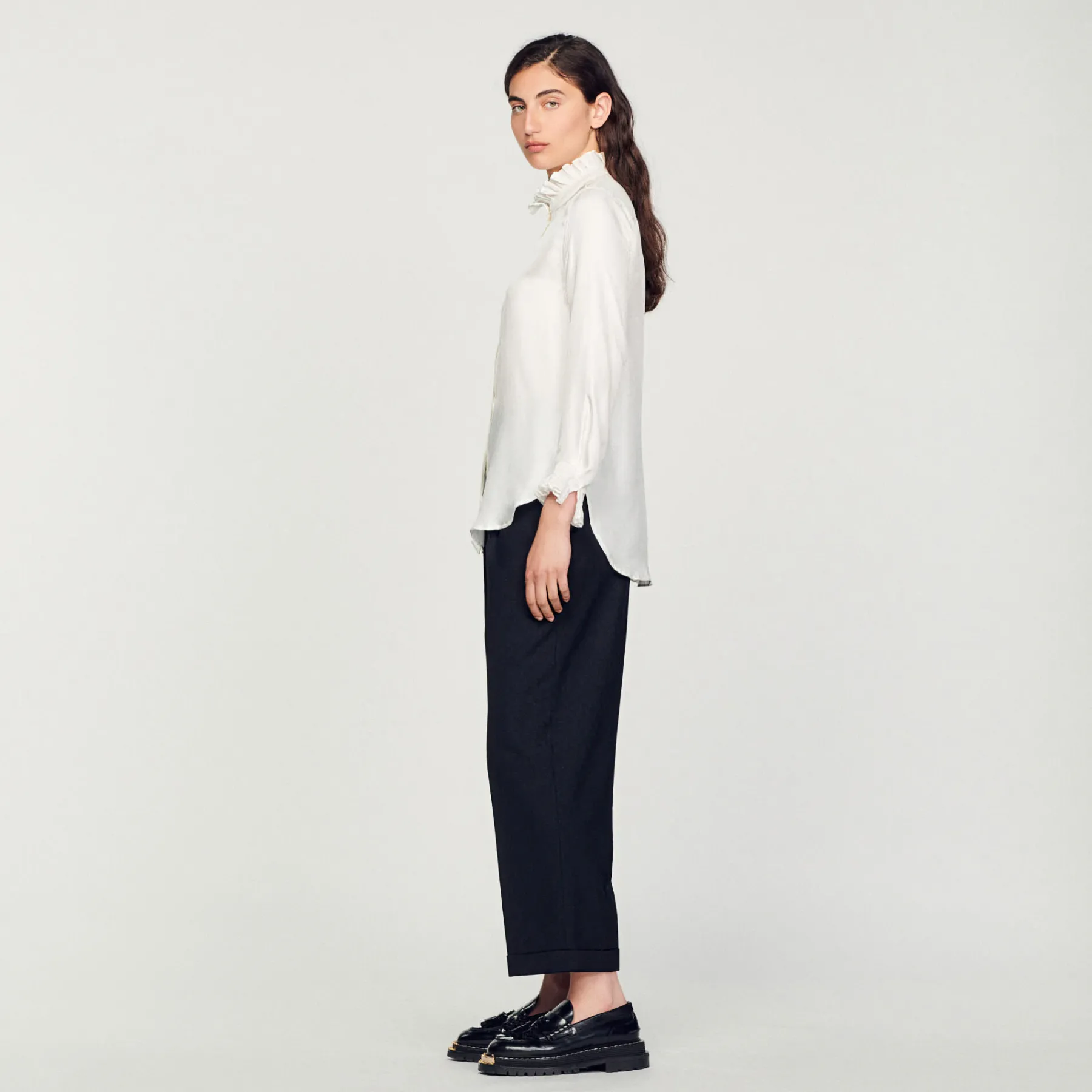 Sandro women’s shirt • Silk floaty shirt • Smocked-effect gathered collar • Long sleeves with gathered cuffs • Rounded asymmetric hem The model is 5’10” tall and wears a size 1 FR / 4 US