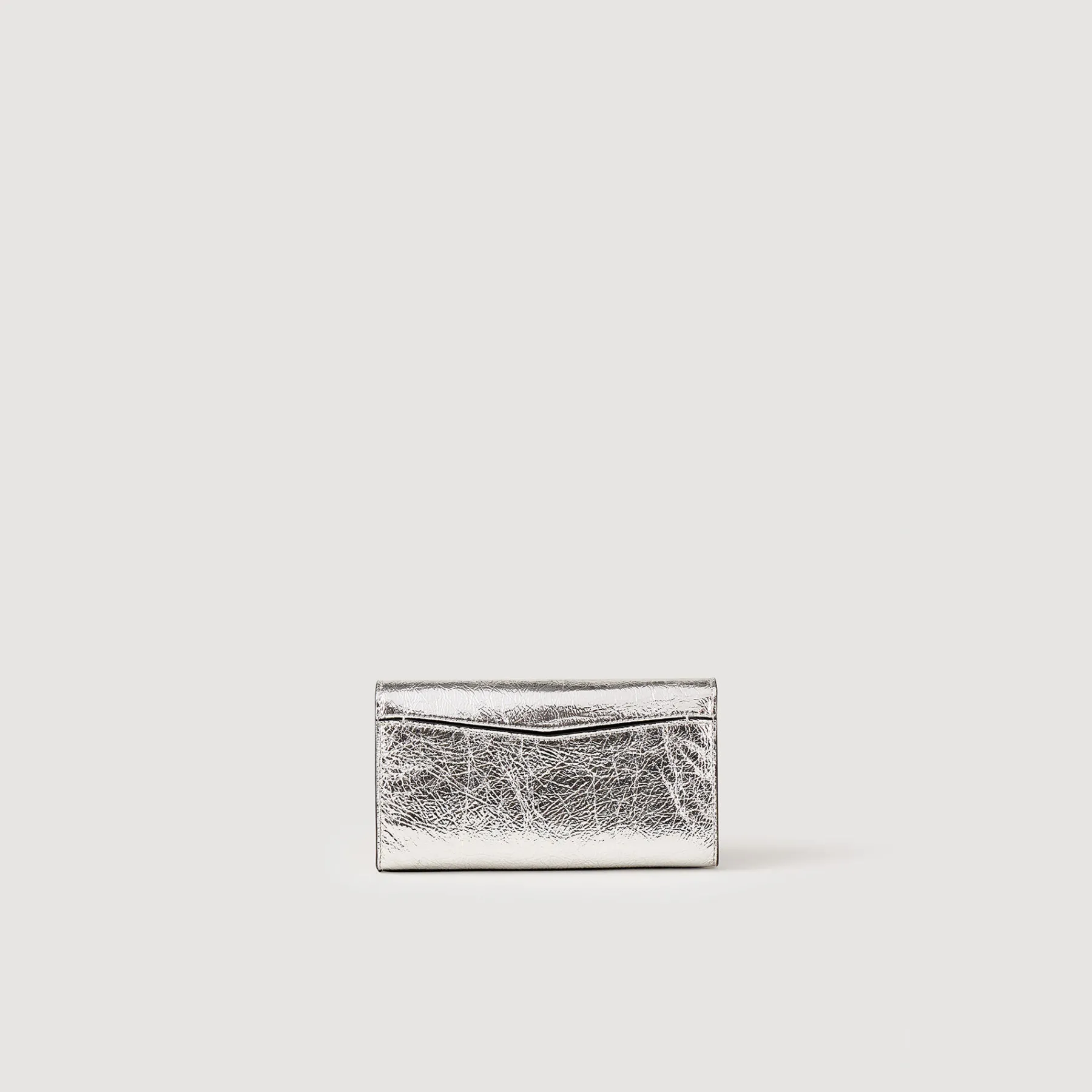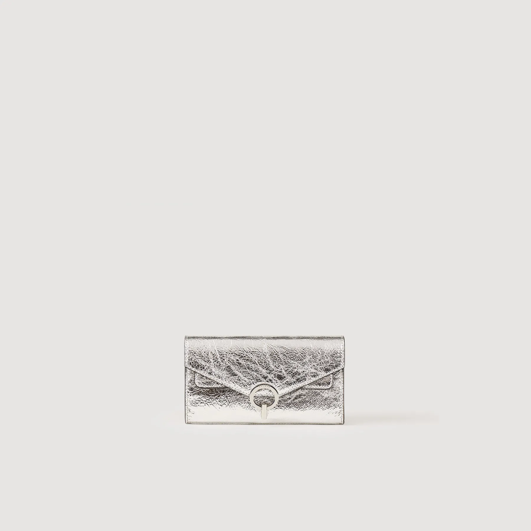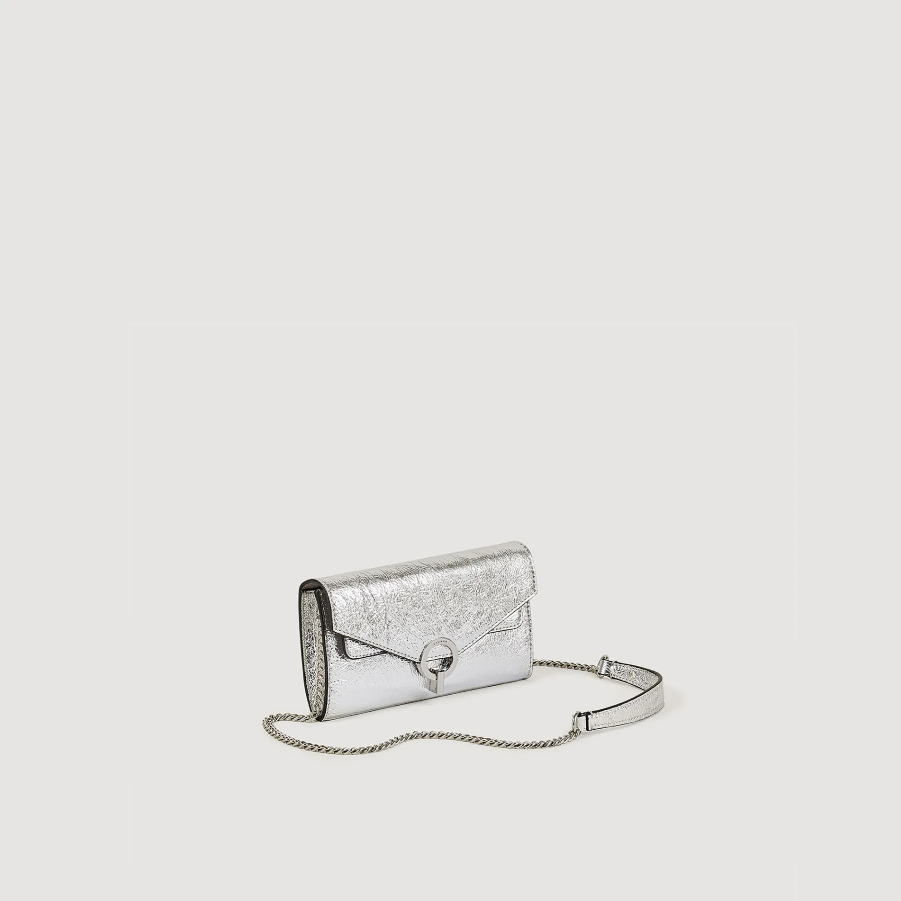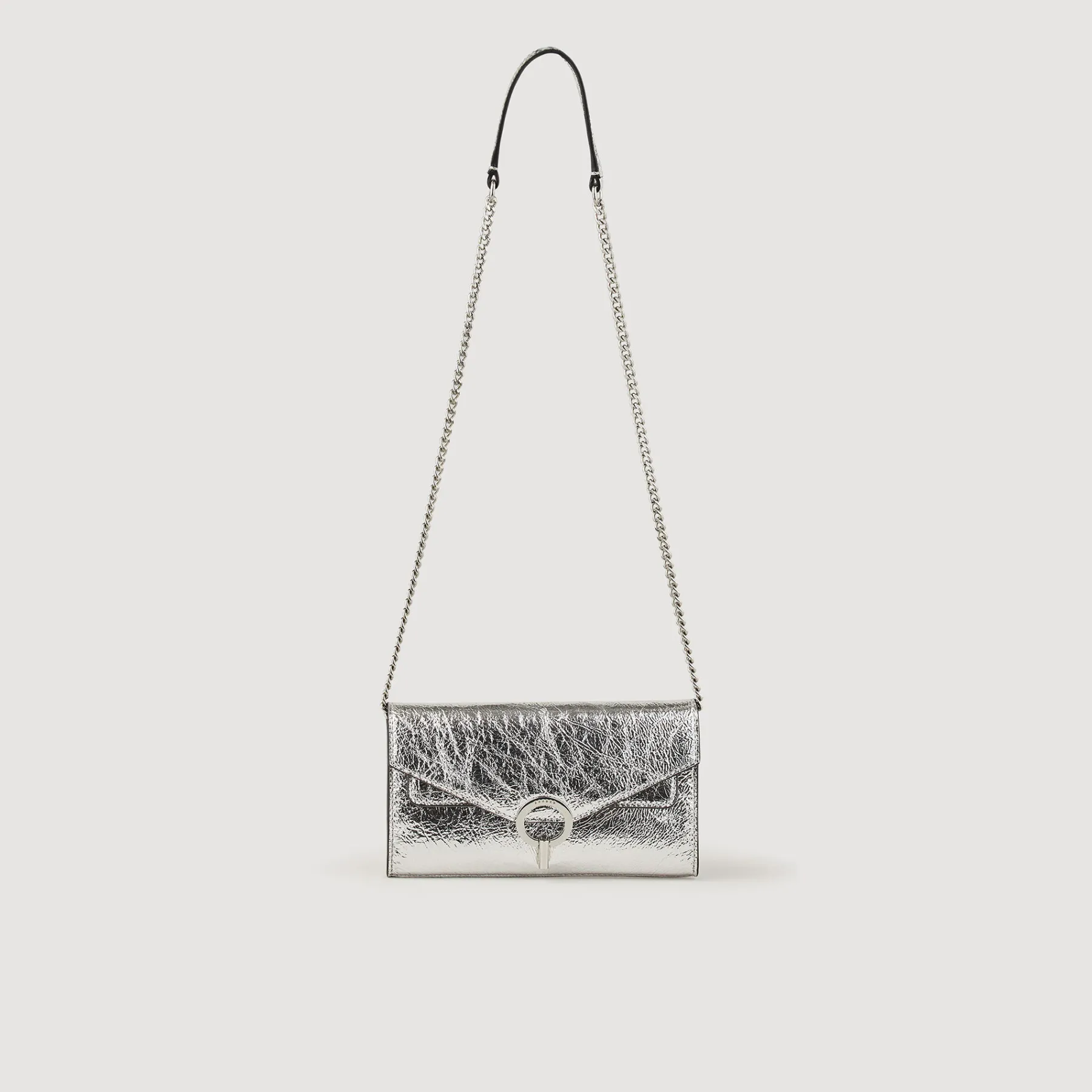 The iconic Yza Bag in metallic silver leather. Featuring a graphic signature clasp and a chain strap, it can be worn in multiple ways: on the shoulder, acrs the body, or as a clutch.